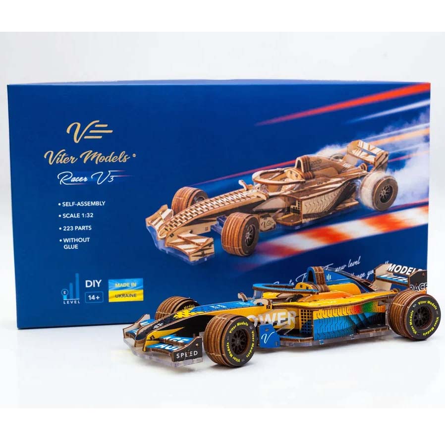 Der Racer V3 in der Farbe UA ist ein DIY-Bausatz von Veter Models für Erwachsene. Der Rennwagen ist die perfekte Ergänzung für jede Kollektion und läuft bis zu 10 Meter. Bewundern Sie den schönen betriebsbereiten 8-Zylinder-V-Motor und die rotierenden Vorderräder! Mit 223 perfekt zugeschnittenen Teilen, einer leicht zu lesenden Bedienungsanleitung und einem wunderschönen Modell wird Sie dieser mechanische Holzbausatz sicherlich beeindrucken.