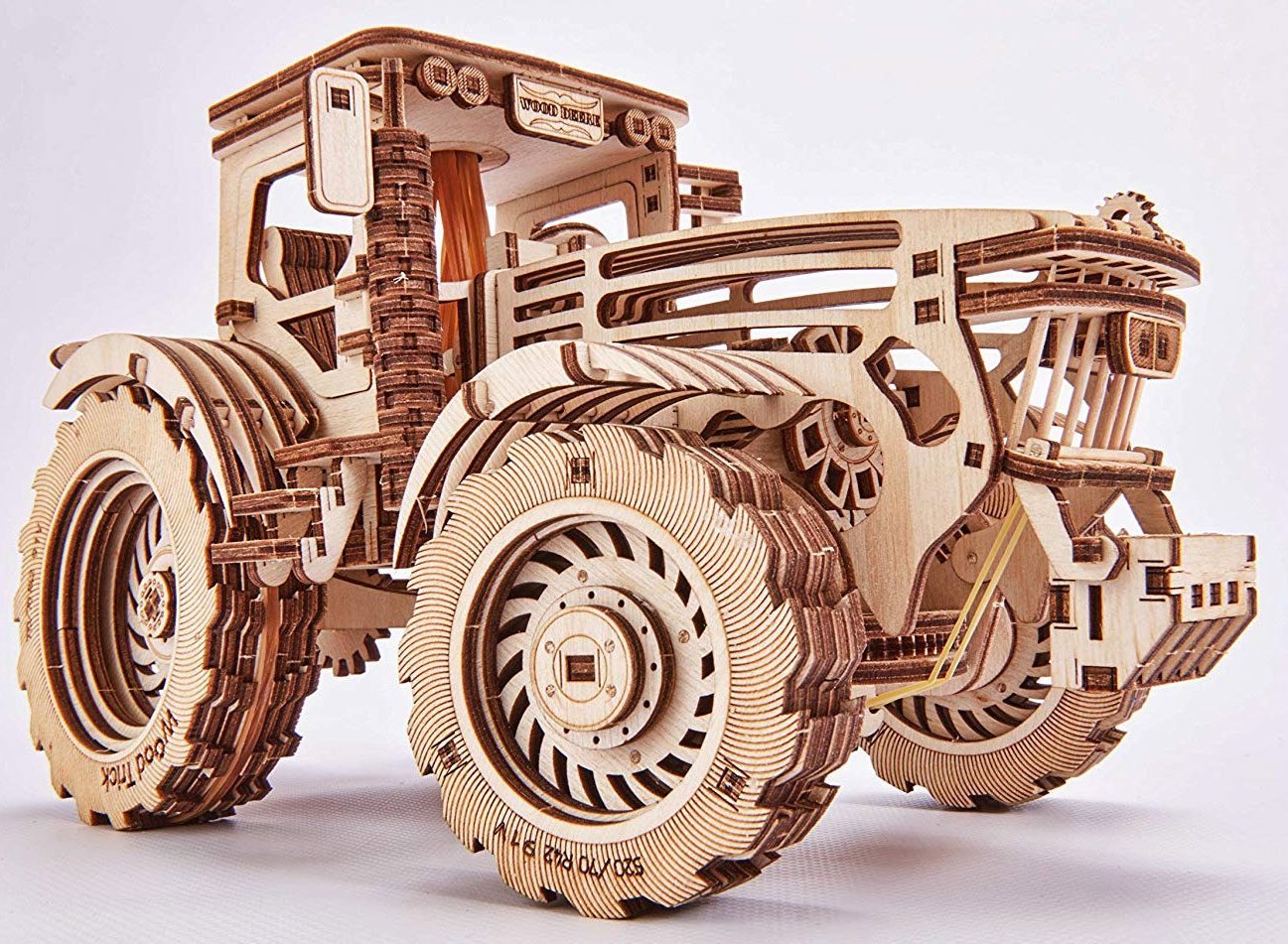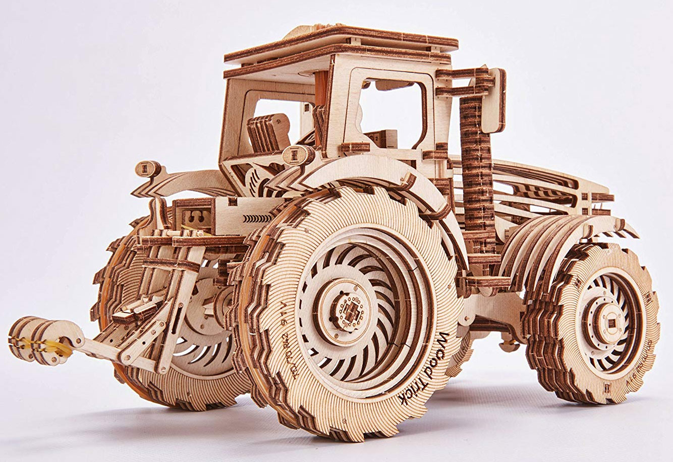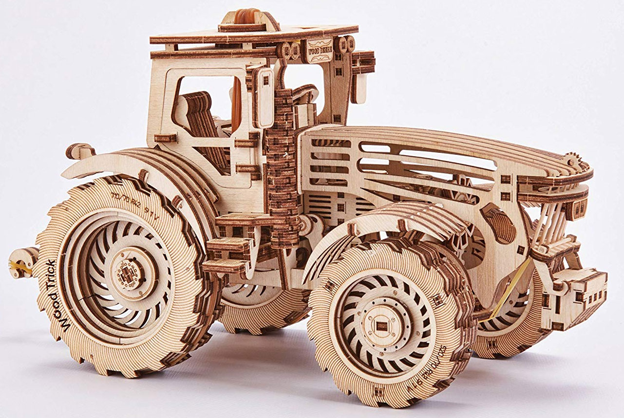 Der Traktor von Wood Trick ist eines der beweglichsten Modelle von Wood Trick. Die Motorhaube läßt sich über einen Hebel in der Fahrerkabine öffnen, darunter befindet sich der Motor mit sich bewegenden Zylindern. Die Türen der Fahrerkabine lassen sich öffnen und die Vorderräder lenken. Der Traktor ist mit einem Aufziehmotor ausgestattet, der das Modell nach Lösen der Bremse automatisch fahren läßt.
