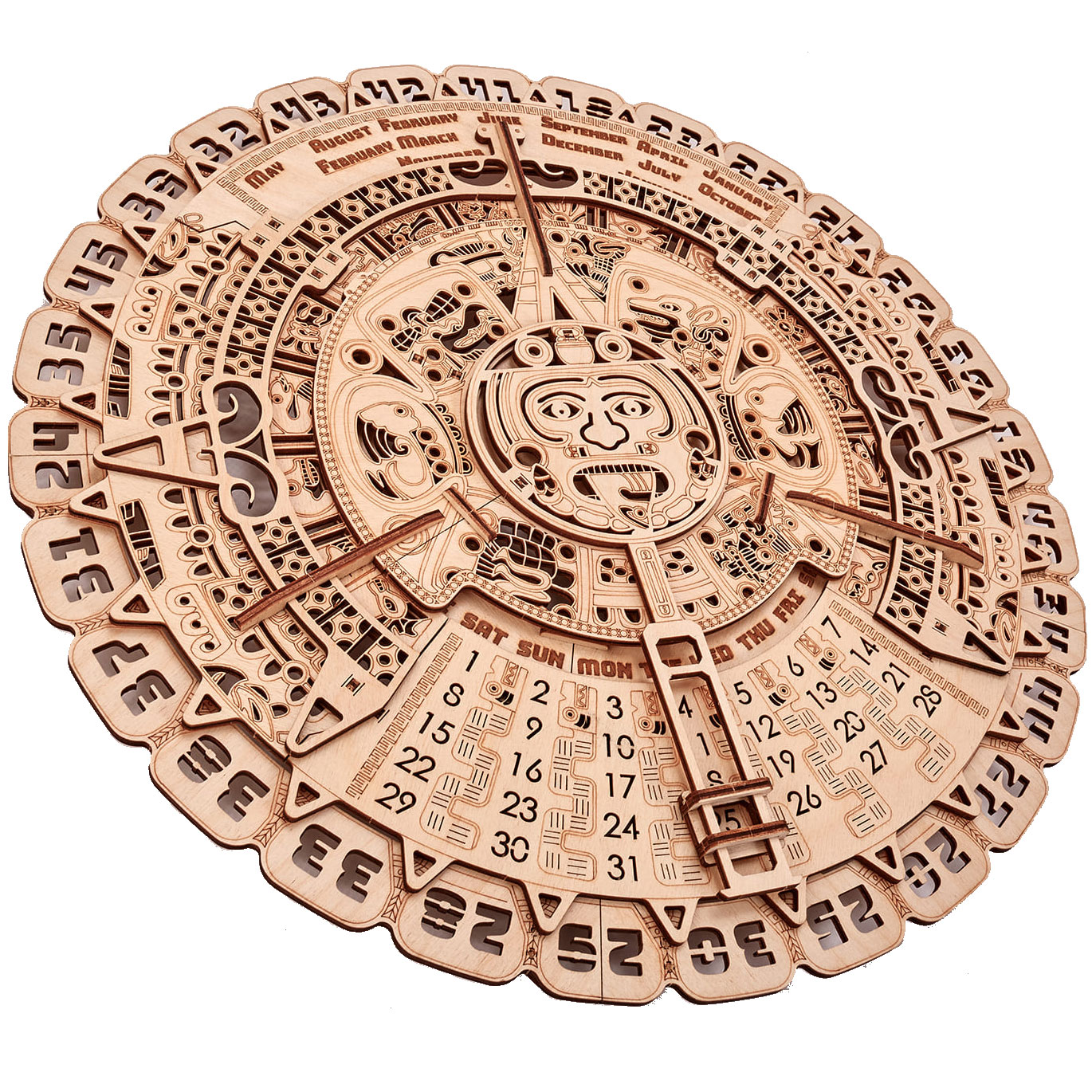Wood Trick bringt mit dem Maya-Kalender (Mayan Calendar) eine wirklich detailreich gestaltete Version des weltberühmten Kalenders als Bausatz heraus. Aber keine Angst, der Kalender sagt keinen Weltuntergang oder andere Katastrophen voraus. Aber er kann Ihnen immer zeigen, welcher Tag der Woche, des Monats oder des Jahres heute ist. Und mit seinen über 40 Zentimetern Durchmesser ist er ein echtes Designstück in jedem zu Hause!