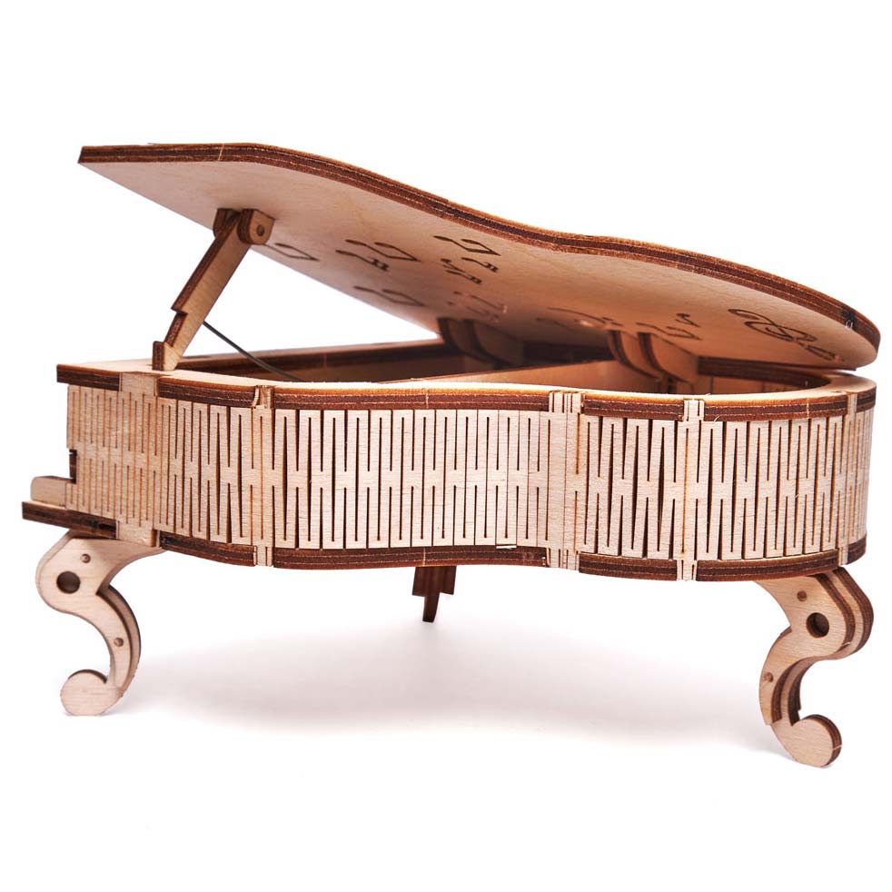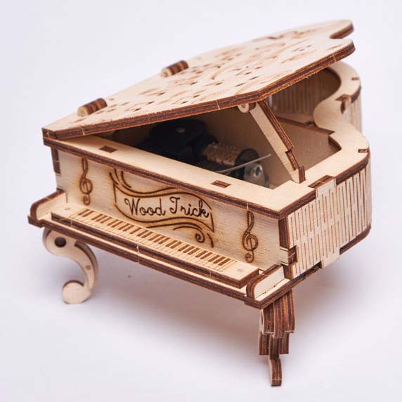 Das "Grand Piano" von Wood Trick, auch "Flügel" genannt, ist eine Bauform des Klaviers. Sein Korpus liegt waagerecht auf drei Beinen. Die geschwungene Korpusform ähnelt dem Flügel eines Vogels oder Engels und gab dieser Klavierform den Namen. Dieses Wood Trick-Modell verfügt über eine Spieluhr, die mit dem Mechanismus am Boden des Flügels mechanisch aufgezogen und abgespielt werden kann. Wie bei einem echten Flügel kann der Deckel aufgeklappt werden.