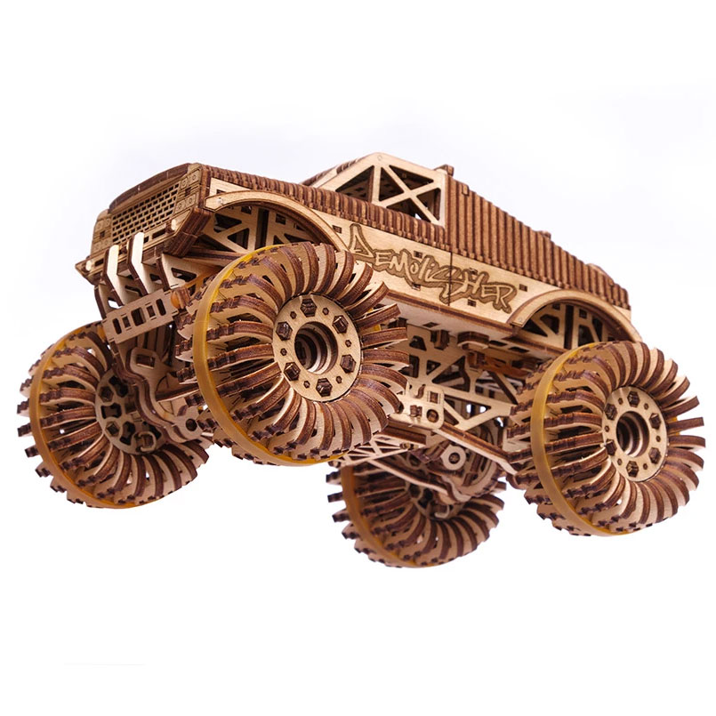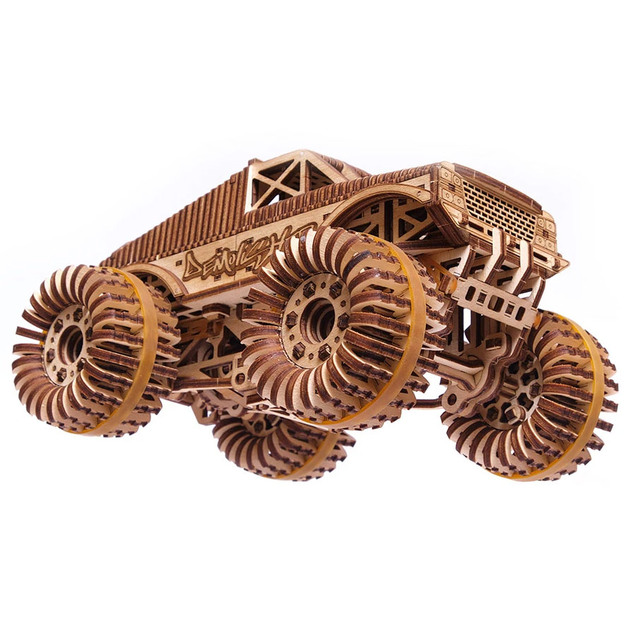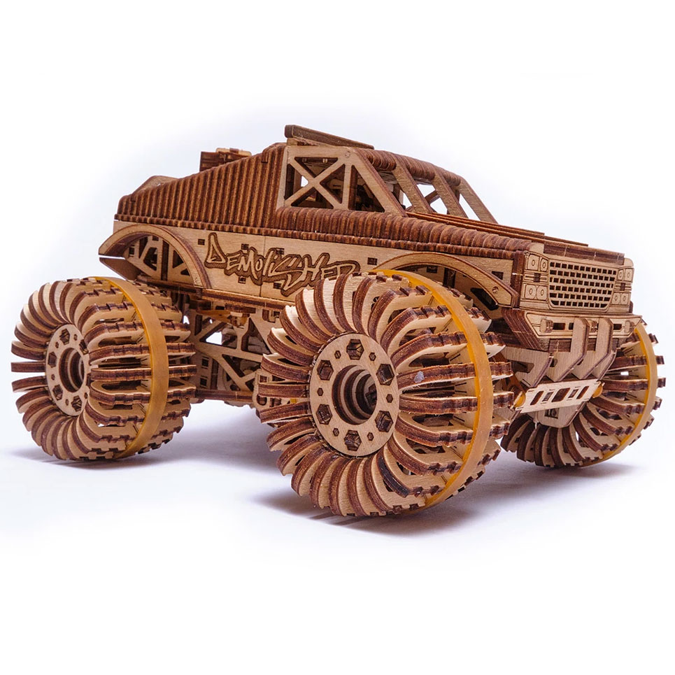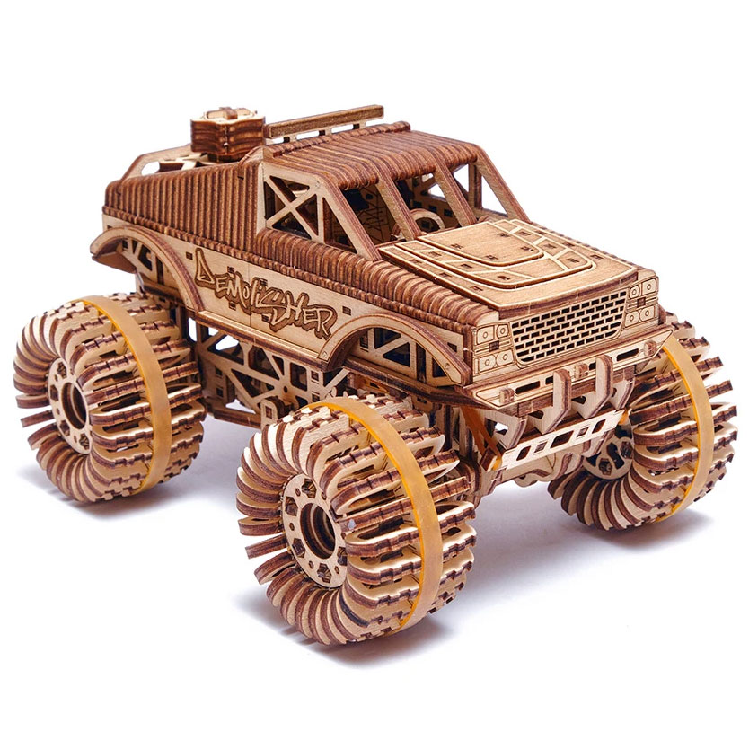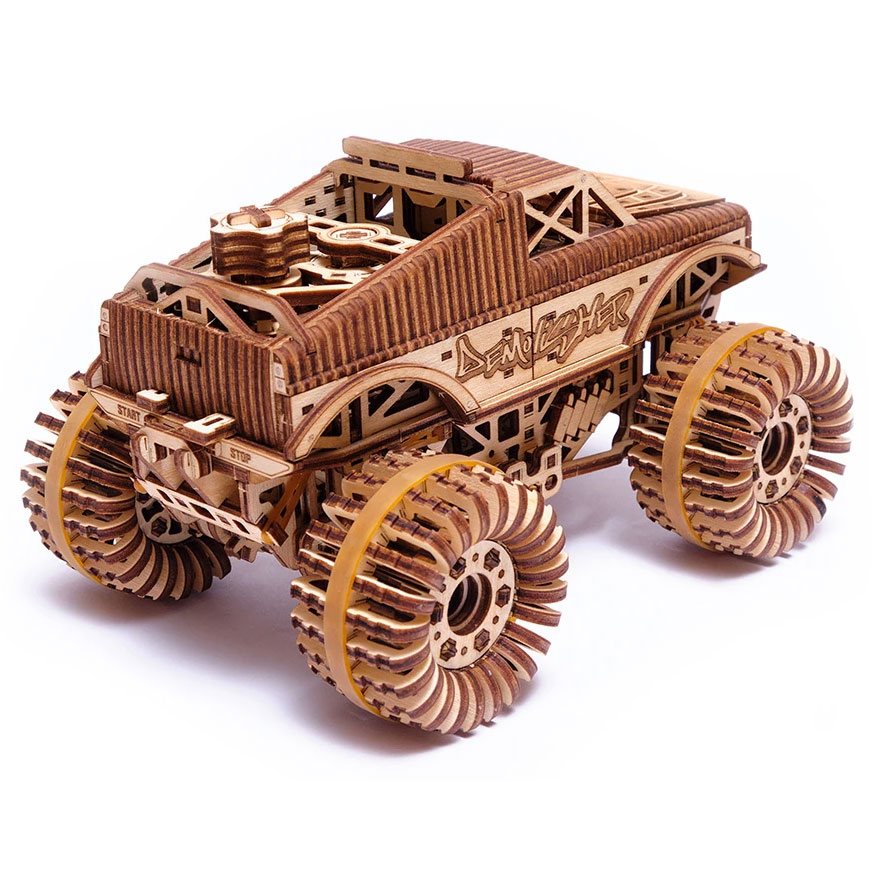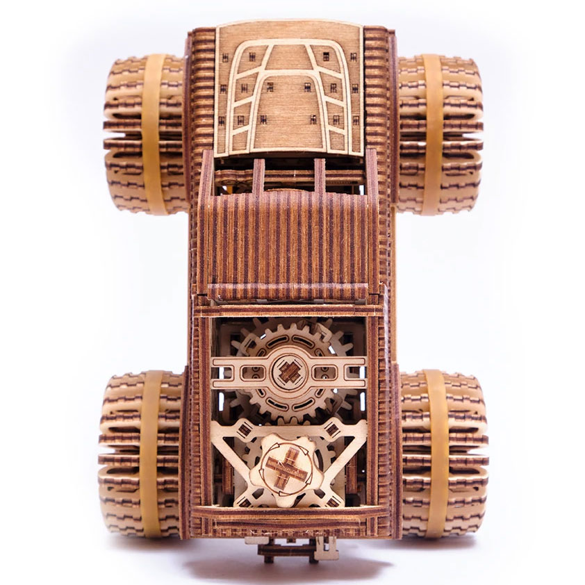 Der Monster Truck von Wood Trick ist ein Bausatz aus 556 Holzteilen. Das Modell verfügt über einen Aufziehmotor, den man durch Drehen eines Hebels aufzieht. Voll aufgezogen kann das Modell 5 bis 6 Meter von alleine fahren.