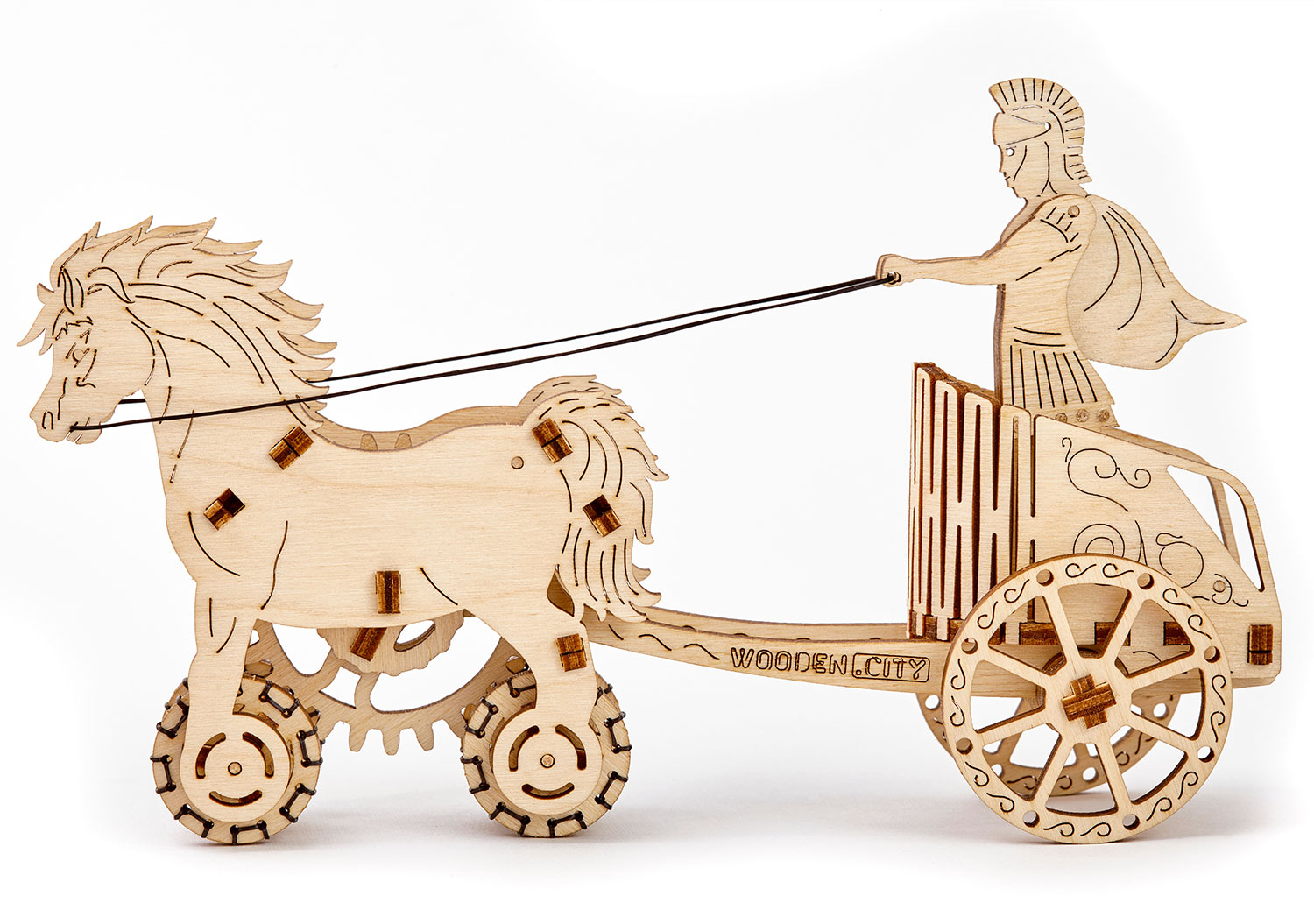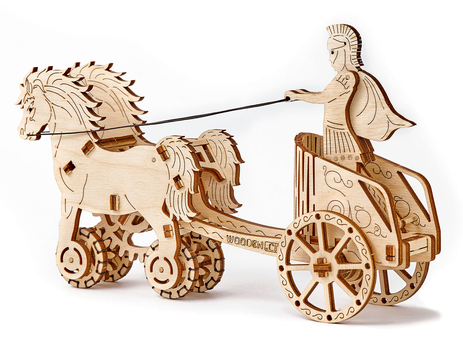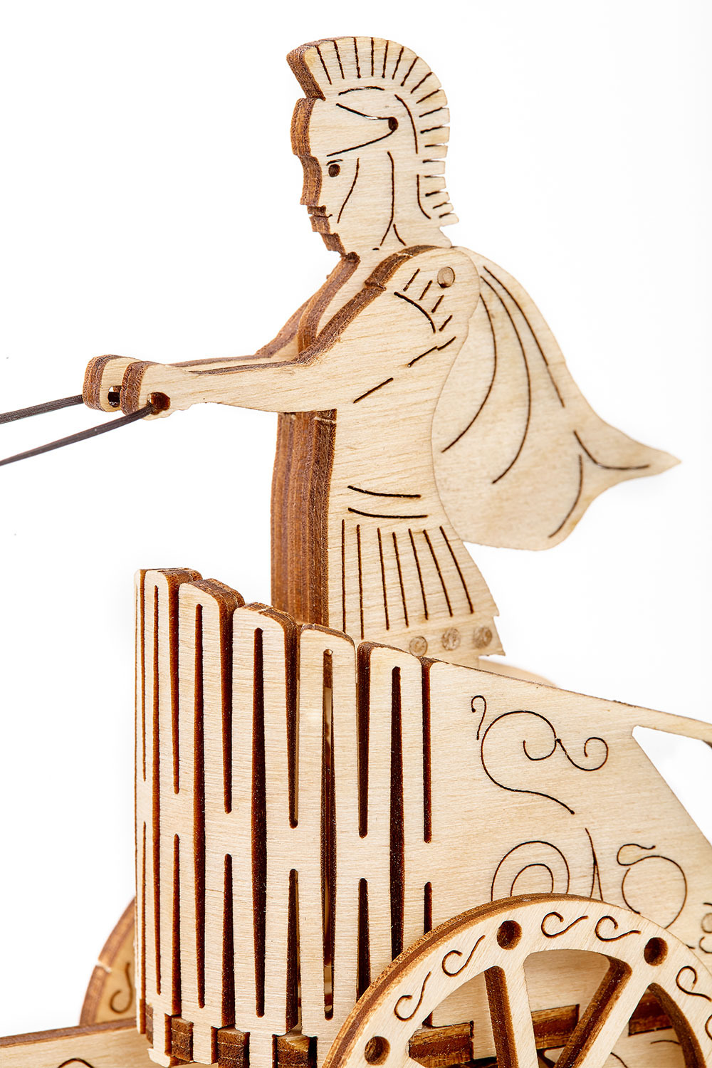 Der Römische Wagen (Roman chariot) von Wooden.City ist ein schönes, historisches Holzmodell. Der Wagen verfügt über einen Aufziehmotor (mit Gummibändern), außerdem bewegt sich der Fahrer, während der Wagen fährt.