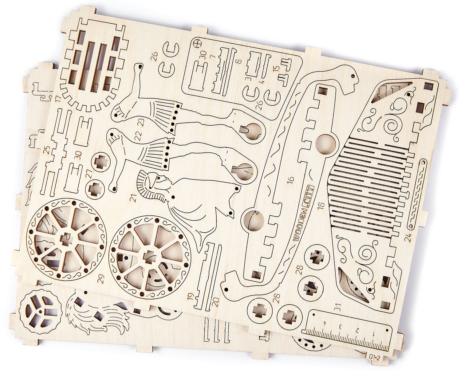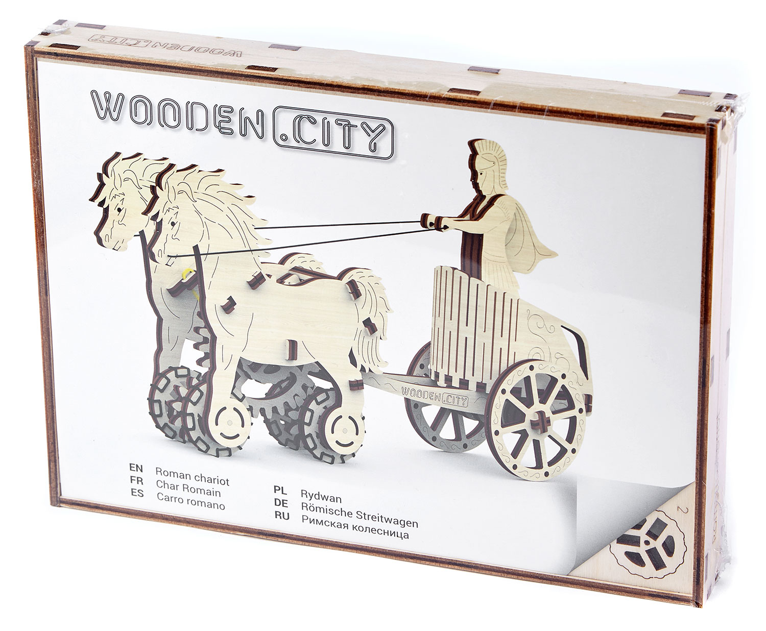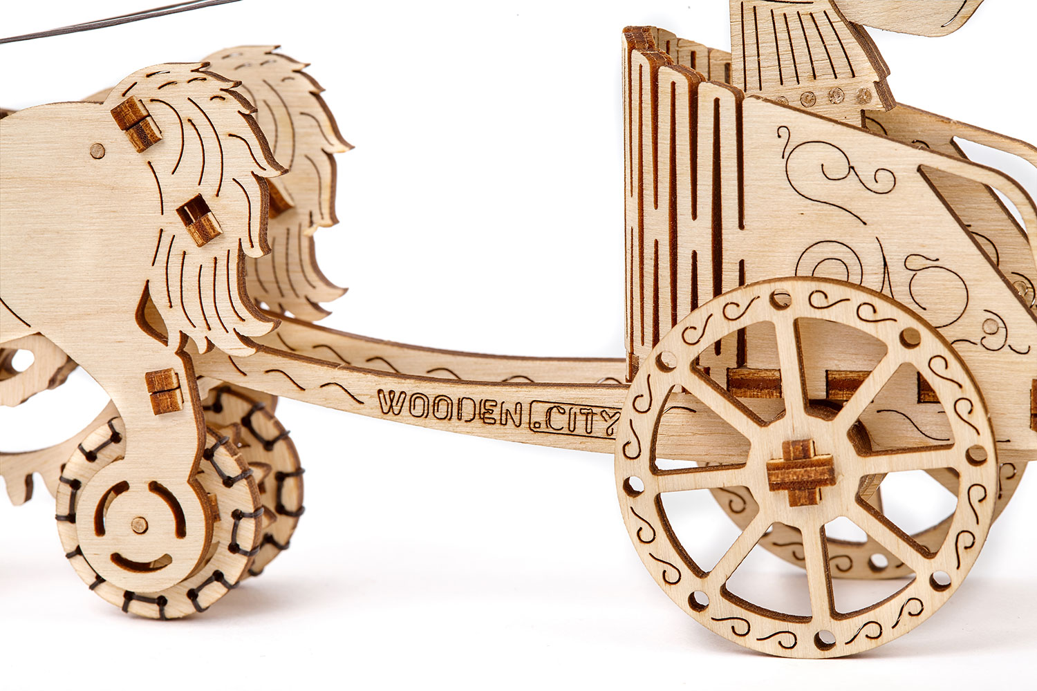 Der Römische Wagen (Roman chariot) von Wooden.City ist ein schönes, historisches Holzmodell. Der Wagen verfügt über einen Aufziehmotor (mit Gummibändern), außerdem bewegt sich der Fahrer, während der Wagen fährt.