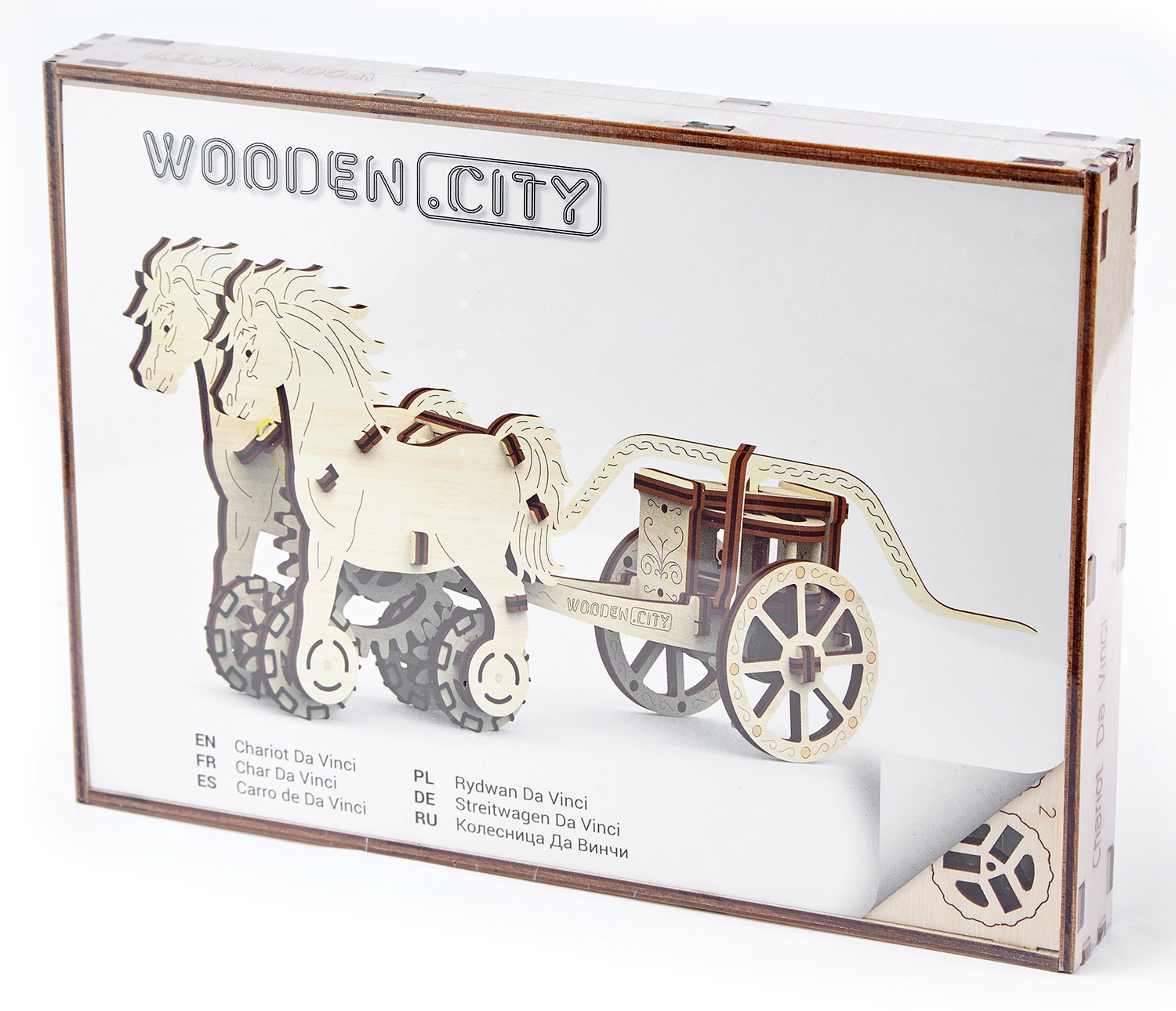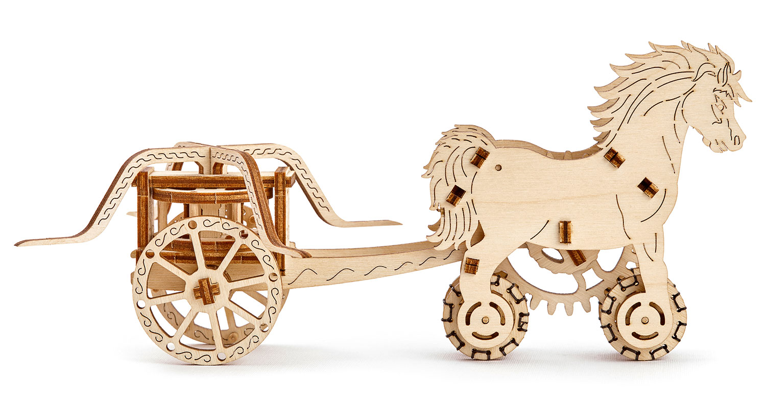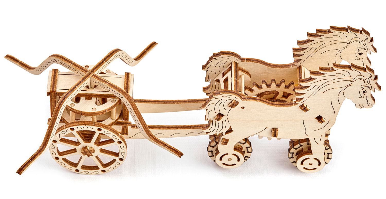 Der Chariot Da Vinci von Wooden.City wurde früher in Kriegen unter anderem von Ägyptern, Griechen, Römern und Persern eingesetzt. Das Modell von Wooden.City verfügt über einen Aufziehmotor (mit Gummibändern), außerdem bewegt sich der Wagenaufbau, während der Wagen fährt.