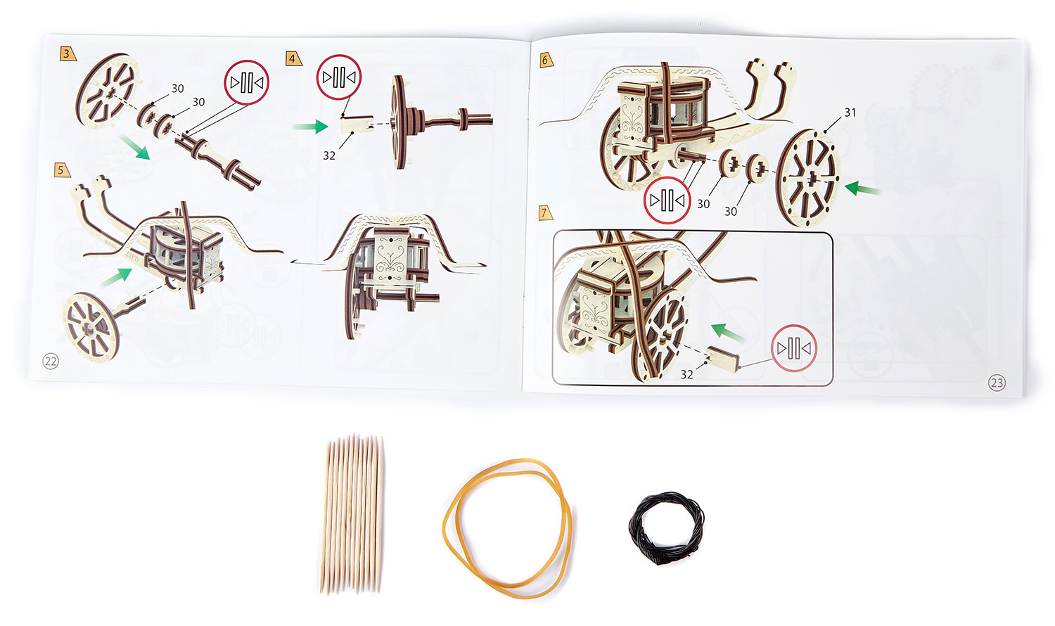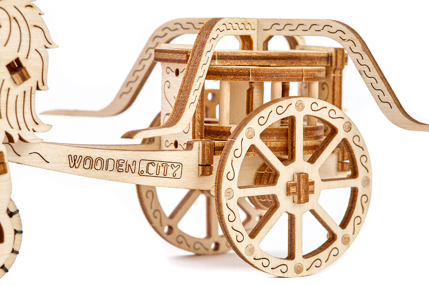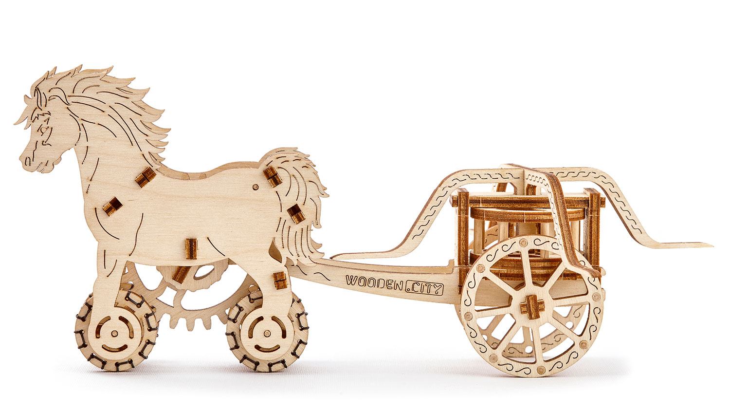Der Chariot Da Vinci von Wooden.City wurde früher in Kriegen unter anderem von Ägyptern, Griechen, Römern und Persern eingesetzt. Das Modell von Wooden.City verfügt über einen Aufziehmotor (mit Gummibändern), außerdem bewegt sich der Wagenaufbau, während der Wagen fährt.