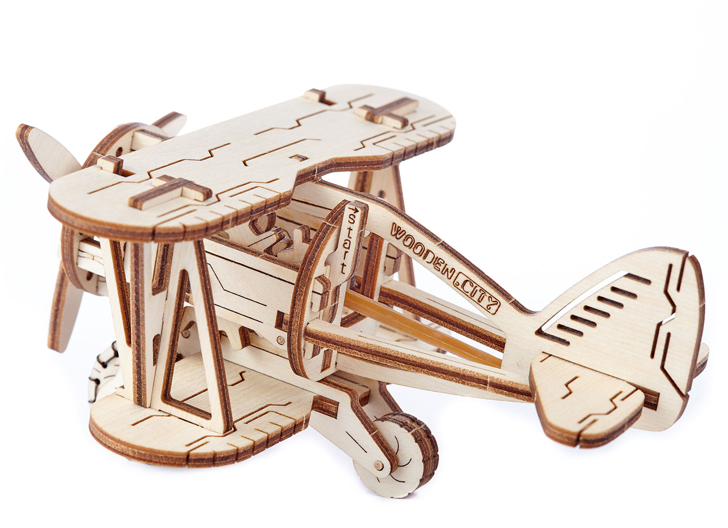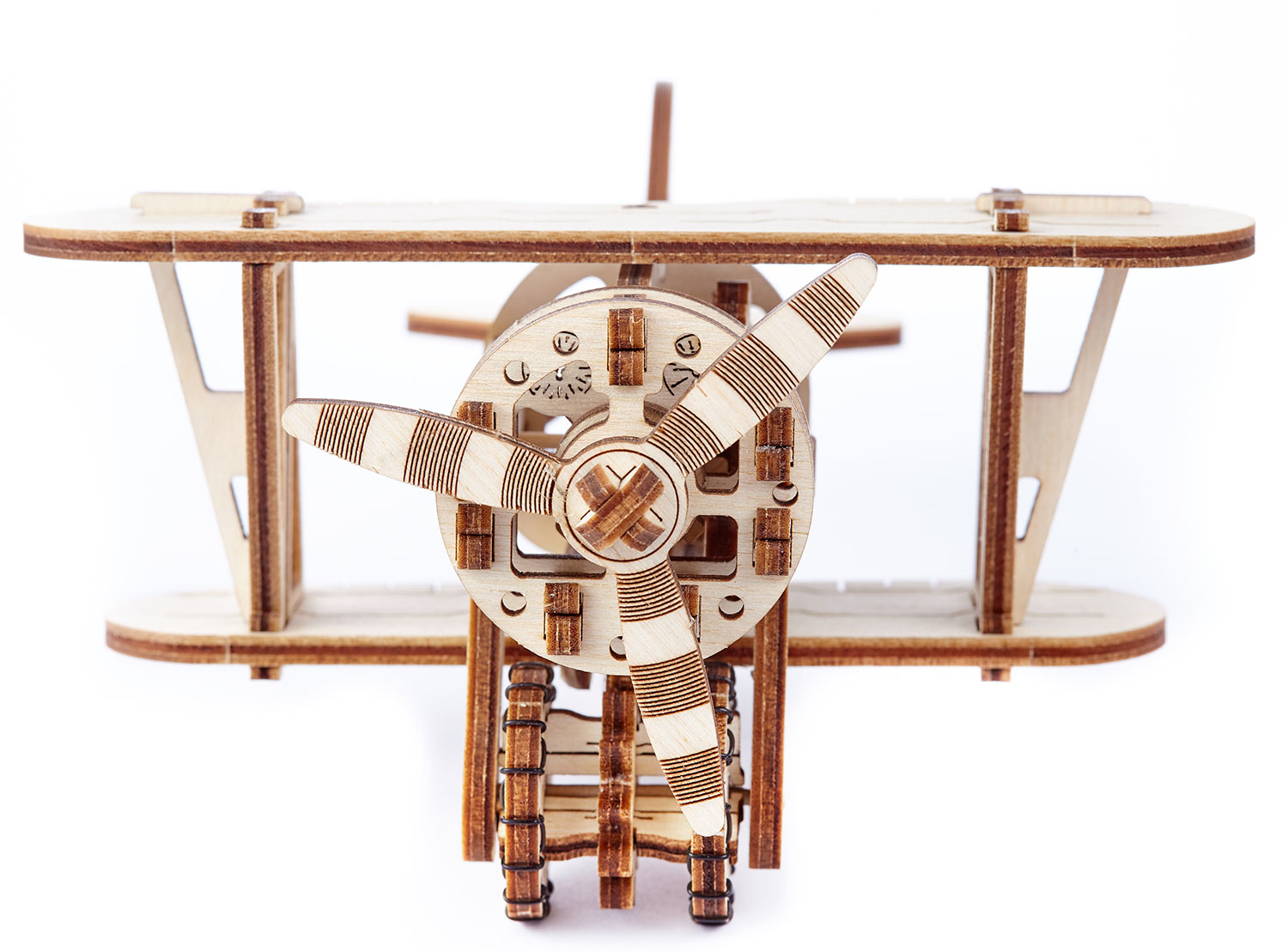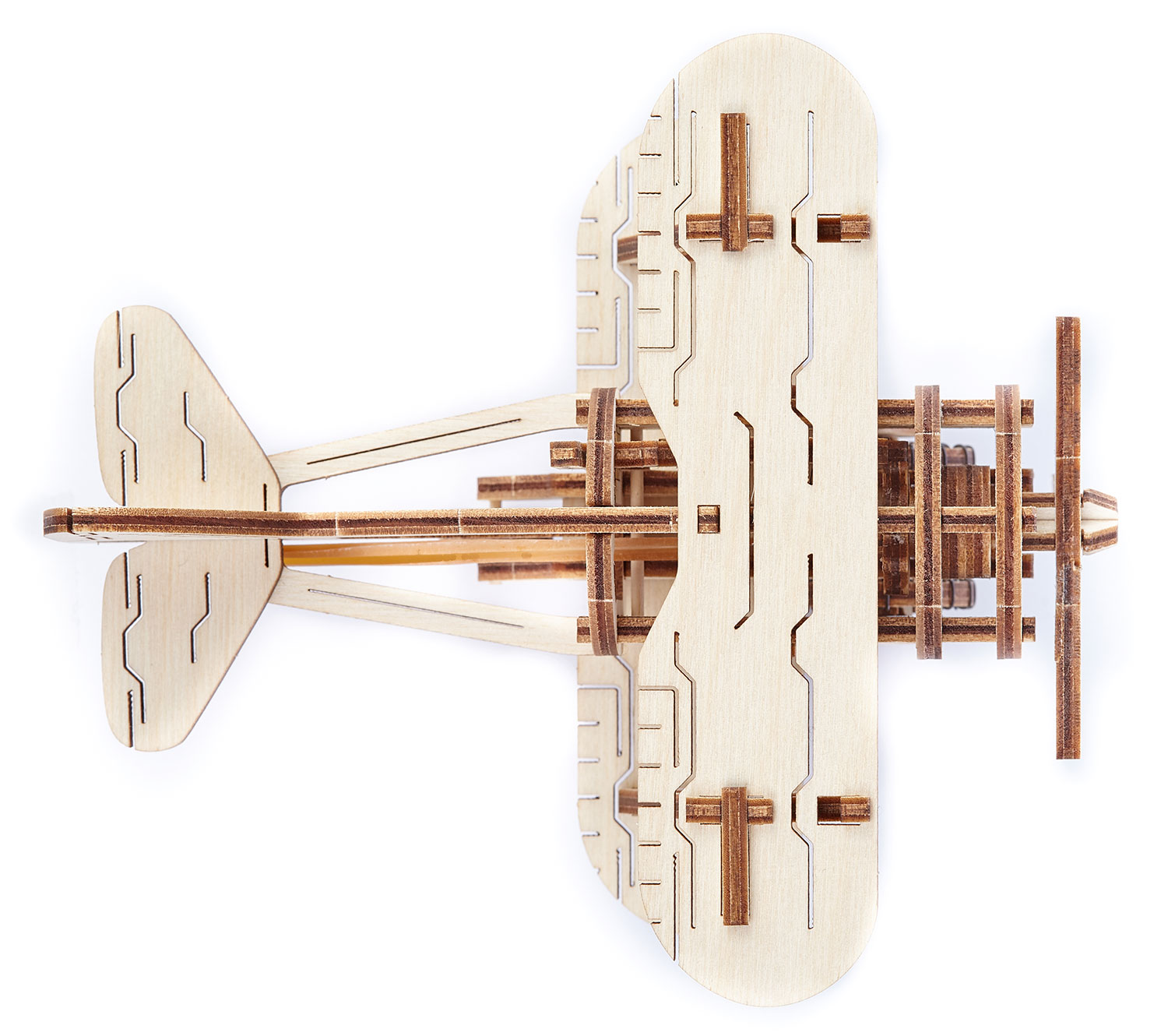 Das Doppeldecker Flugzeug (Biplane) von Wooden.City ist ein kleines Wunderwerk der Technik. Der Aufziehmotor (mit Gummibändern) wird entweder durch Drehen der Räder (Ziehen des Flugzeugs über den Boden) oder Drehen des Propellers aufgezogen. Sobald Sie den Bremshebel nach hinten ziehen fährt das Flugzeug los und der Propeller beginnt sich zu drehen.
