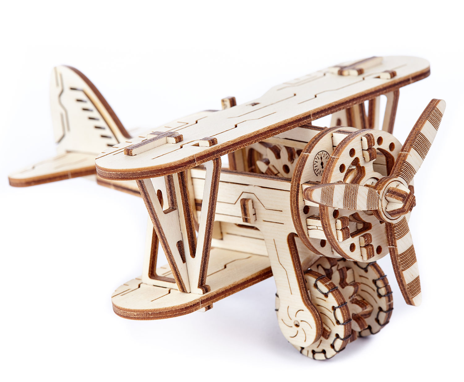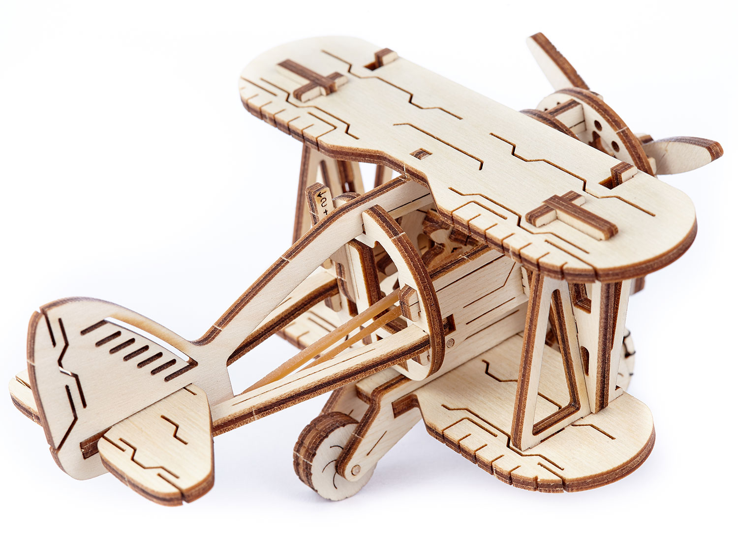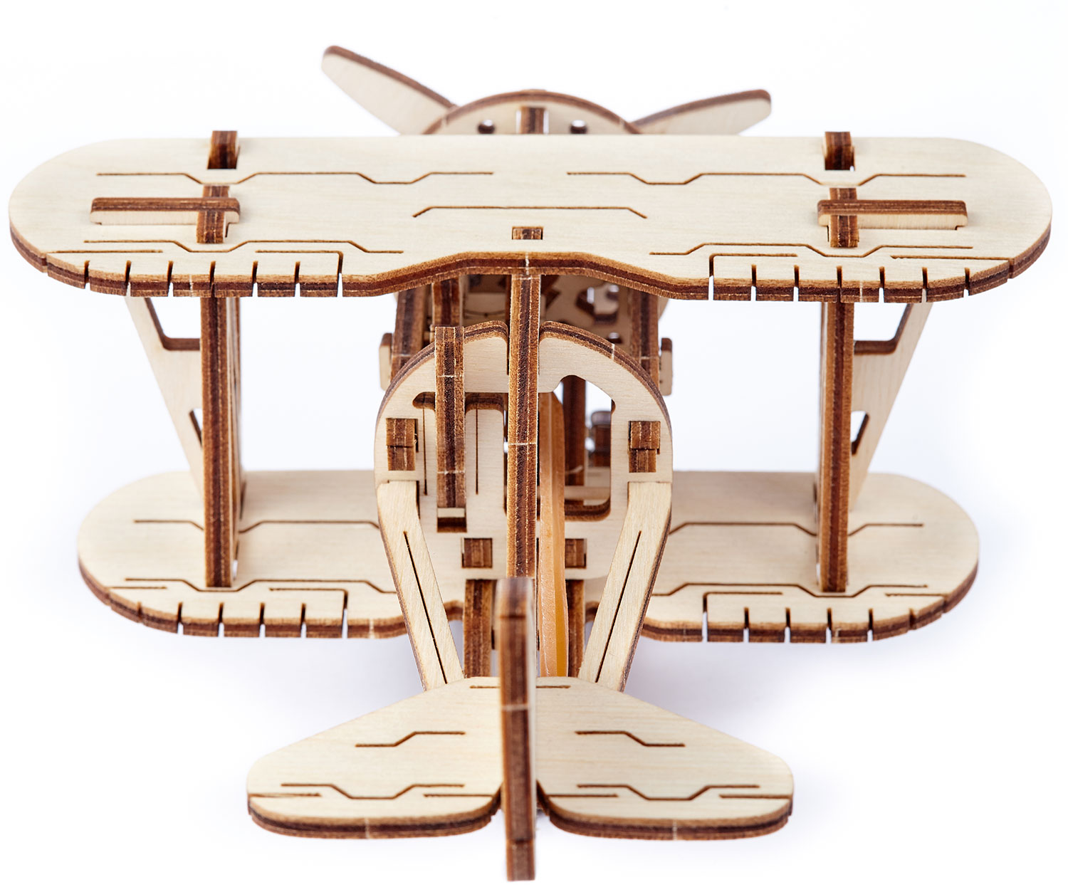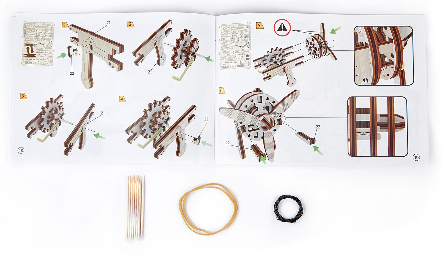 Das Doppeldecker Flugzeug (Biplane) von Wooden.City ist ein kleines Wunderwerk der Technik. Der Aufziehmotor (mit Gummibändern) wird entweder durch Drehen der Räder (Ziehen des Flugzeugs über den Boden) oder Drehen des Propellers aufgezogen. Sobald Sie den Bremshebel nach hinten ziehen fährt das Flugzeug los und der Propeller beginnt sich zu drehen.