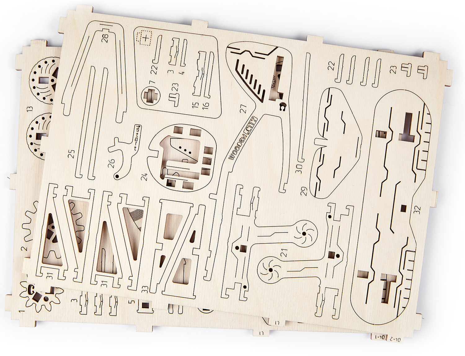 Wooden.City entwickelt und produziert komplexe mechanische Holzmodelle zur Selbstmontage. Die Modelle werden ohne Klebstoff zusammengebaut. Alle Teile sind per Laser bereits zugeschnitten, Sie müssen keine Teile schneiden oder sägen. Drücken Sie einfach die Einzelteile aus den Brettern heraus und beginnen Sie mit der Montage.