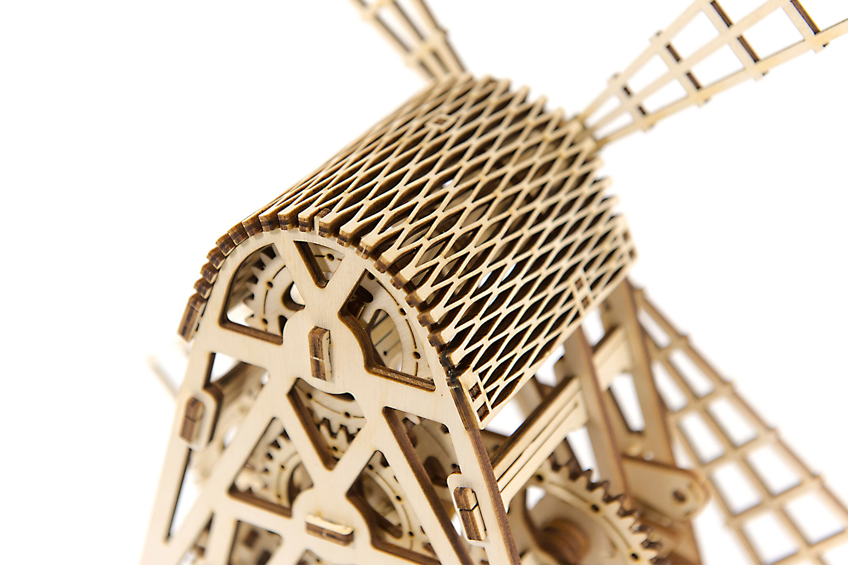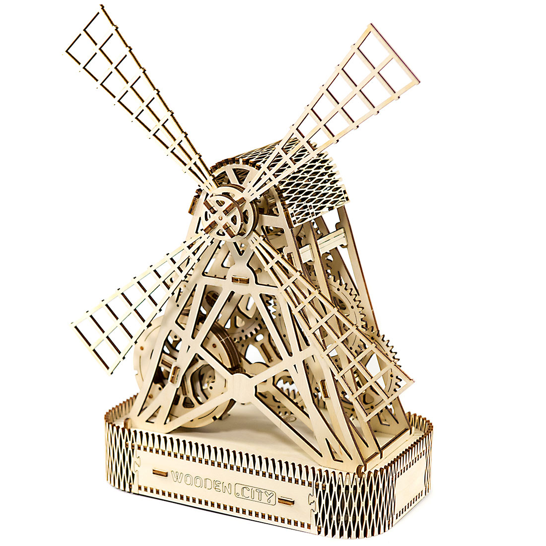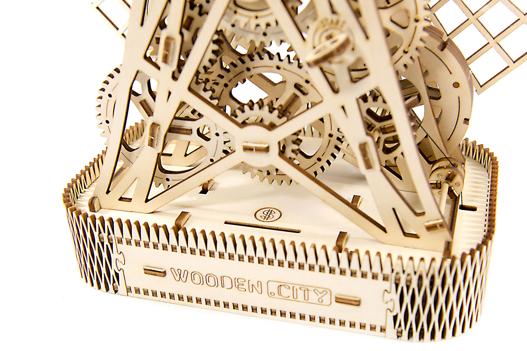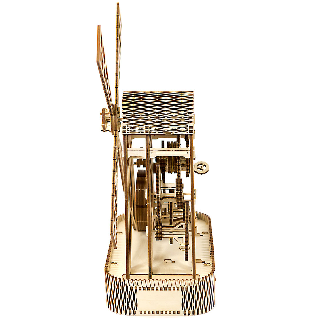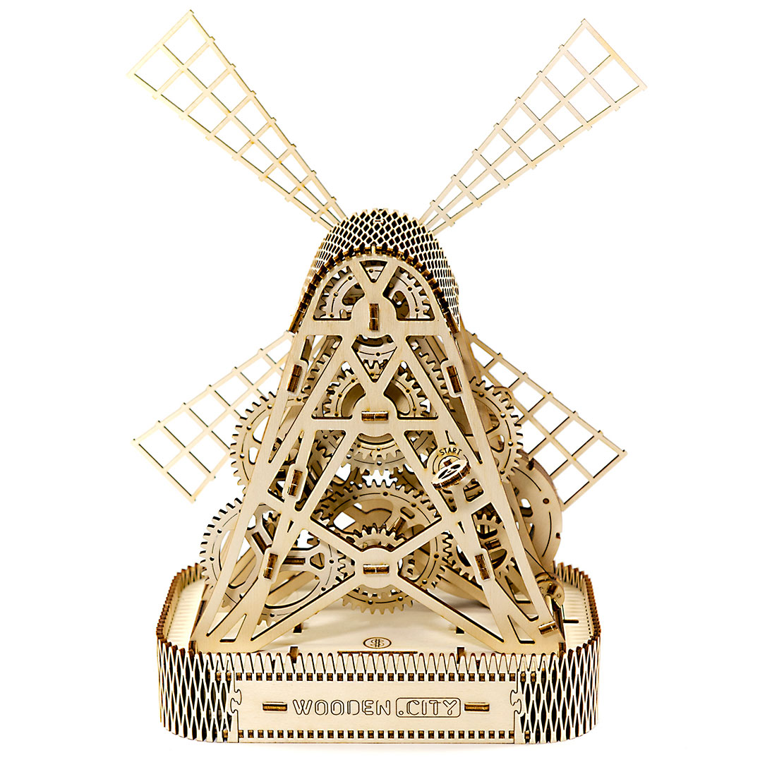 Die Windmühle (Mill) von Wooden.City verfügt über einen komplexen Aufziehmotor (mit Gummibändern), der die Windräder ca. eine Minute lang drehen läßt. Aufgezogen mit einem Schlüssel läßt sich das Drehen der Windräder über einen Hebel starten. Ein echter Hingucker, der zudem über eine Box und ein geheimes Münzfach verfügt. Mit 222 Teilen ist außerdem für einige Aufbauzeit und Bastelspaß gesorgt.