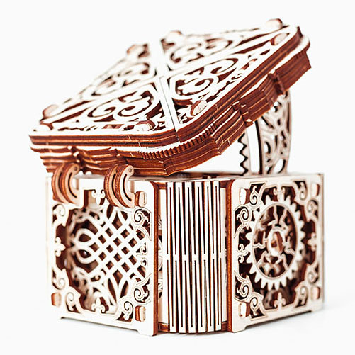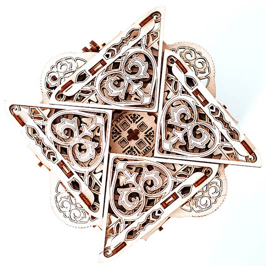 Die Mystery Box von Wooden.City ist ein Modell voller faszinierender Überraschungen. Baue die komplex konstruierte Mystery Box ganz ohne Klebstoff zusammen und entdecke dabei ihre Geheimnisse. Im Innern der Mystery Box befindet sich ein Fach zur Aufbewahrung und zum Verbergen von Münzen, Schlüsseln oder anderen Kleinteilen. Die Mystery Box verfügt über einem verborgenen Mechanismus zum Verschieben der einzelnen Deckelteile. Erst danach kann die Mystery Box mit einem speziellen Schlüssel geöffnet werden.