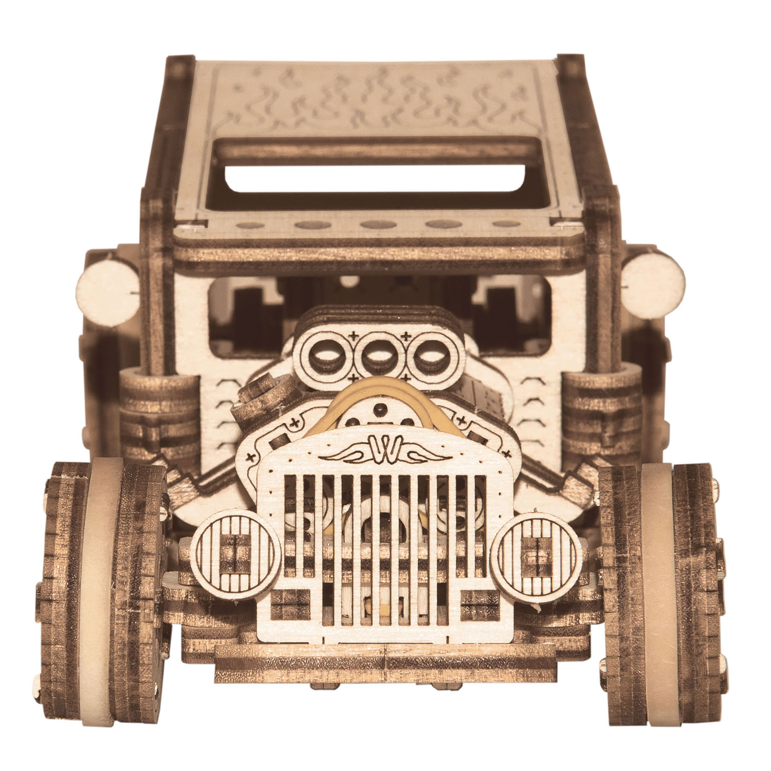 Als Hot Rod bezeichnet man ein speziell modifiziertes, klassisches US-amerikanisches Automobil mit leistungsstarkem V8-Motor für hohe Geschwindigkeiten und einer aus optischen Gründen veränderten Karosserie. Der Hot Rod von Wooden City verfügt über eine Vielzahl attraktiver Funktionen, z.B. bewegliche Türen und Vorderräder, Rückziehmechanismus und gummierte Räder. Der Blick durch das Dach auf den Motor, die Fahrzeugsitze und den Schalthebel lässt die Herzen von Fahrzeugenthusiasten höher schlagen.