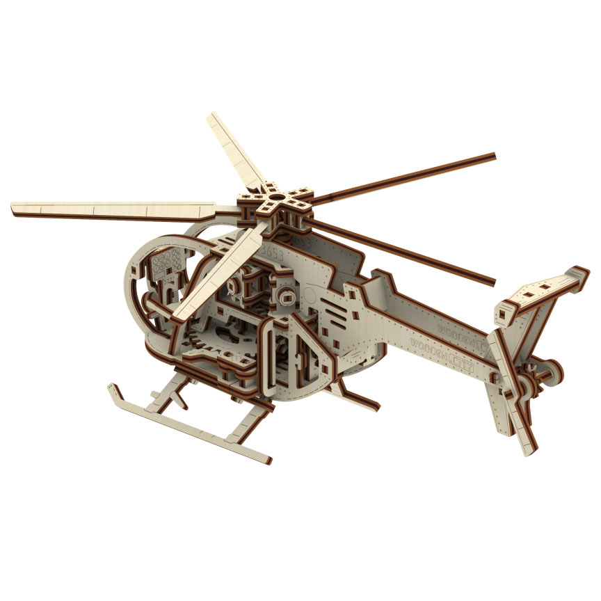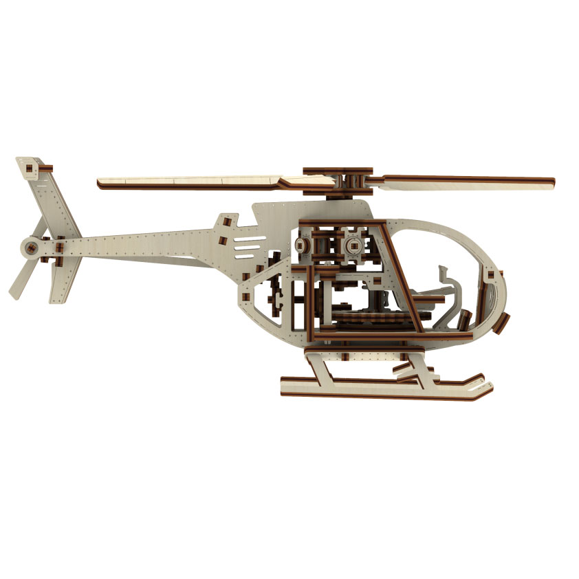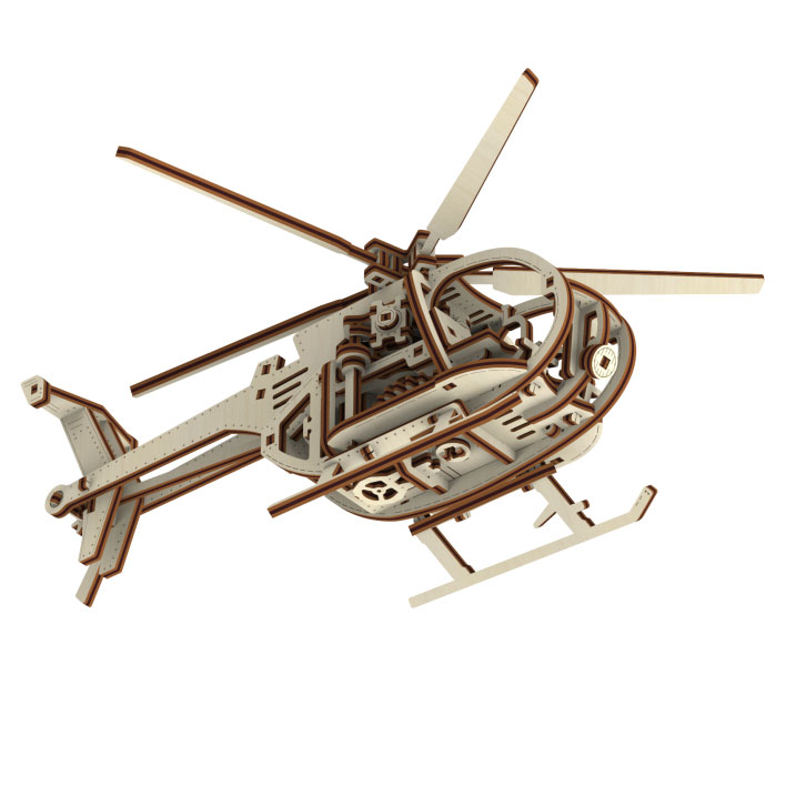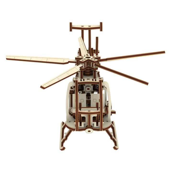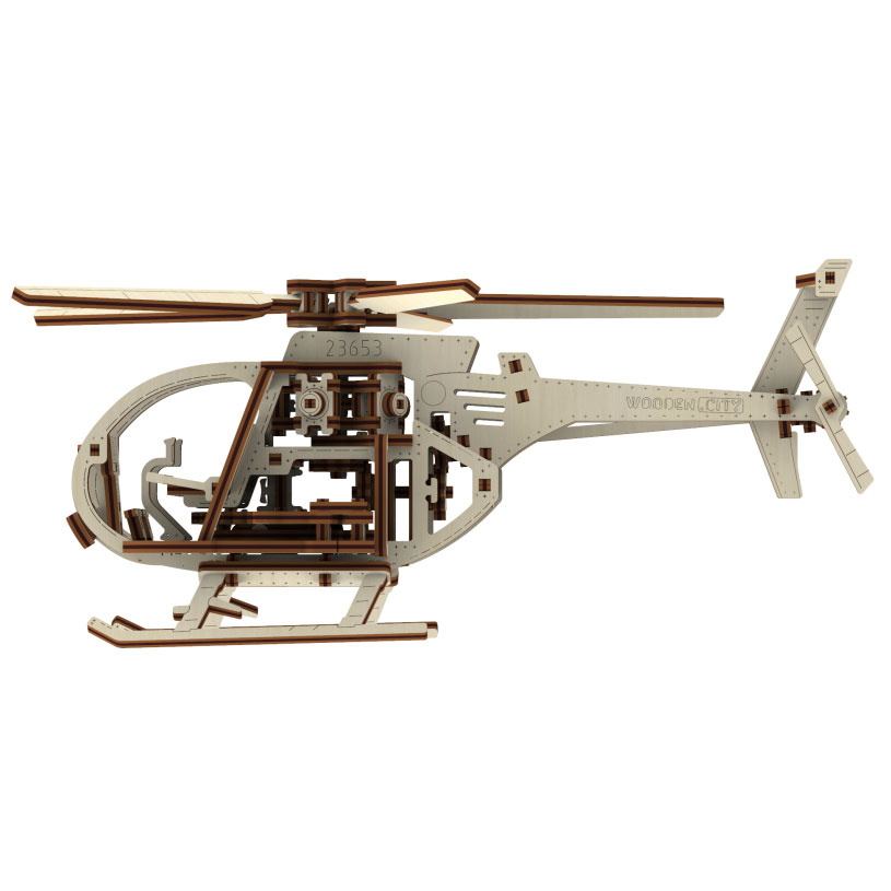 Der Helicopter von Wooden.City ist der erste Hubschrauber dieser Art. Ausgestattet mit einem Aufziehmotor drehen sich der Rotor und der Heckrotor automatisch.
