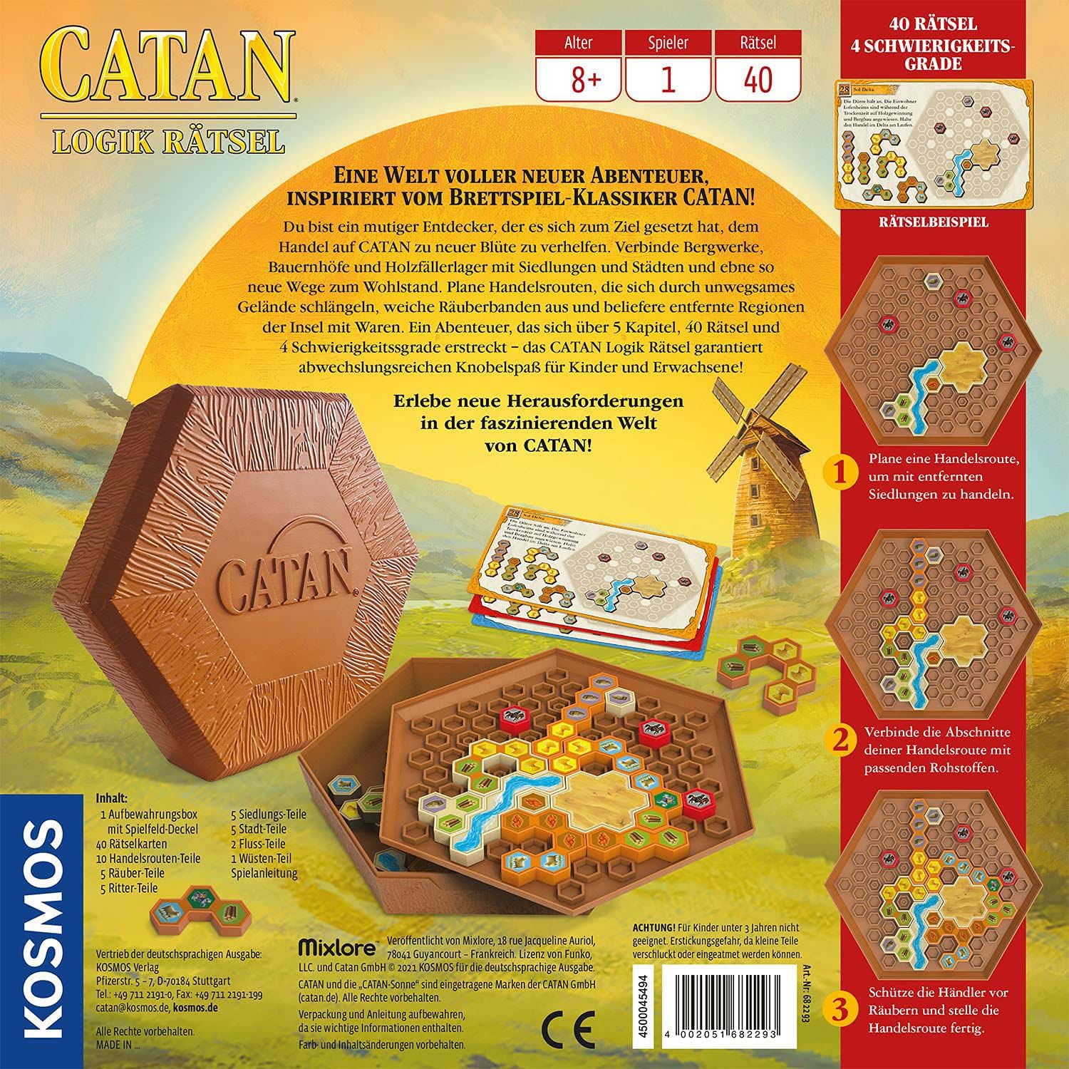 Knobelspaß in der Welt von CATAN! Ein Spieler plant neue Handelsrouten, um entfernte Regionen der Insel mit Waren zu beliefern. Jede Rätselkarte zeigt Siedlungen und Städte, zwischen denen eine Handelsroute errichtet werden muss. Es warten viele Hindernisse und unwegsame Landschaften! Außerdem haben es Räuber auf die Waren abgesehen. Ritter müssen die Händler beschützen! Wer reiht die Rohstoffe so aneinander, dass eine Handelsroute entsteht? 5 Kapitel, 40 Rätsel, 4 Schwierigkeitsstufen: ein Logik Rätsel in der berühmten Welt des Brettspiel-Klassikers CATAN für Kinder und Erwachsene.