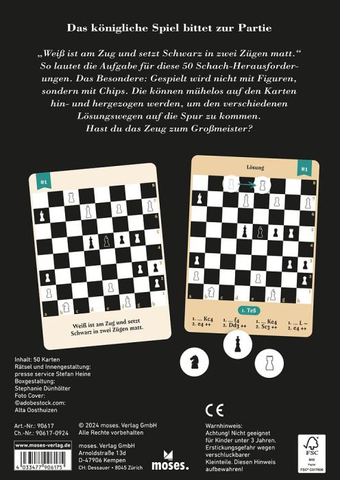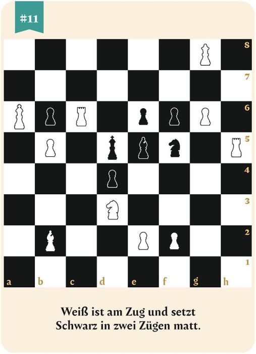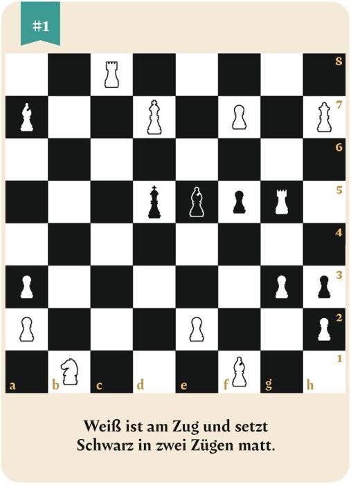 Das perfekte Geschenk für alle Schach- und Rätselfans! 50 x Schachmatt in 2 Zügen: Mit der großen Box der Schachrätsel wirds knifflig hier sind Köpfchen und Taktik gefragt! Ziel ist es, dass Weiß am Zug ist und Schwarz in nur zwei Zügen schachmatt setzt. Das Besondere: Gespielt wird nicht mit Figuren, sondern mit Chips, die mühelos auf den Karten hin- und hergeschoben werden können. So können die verschiedenen Lösungswege getestet werden.