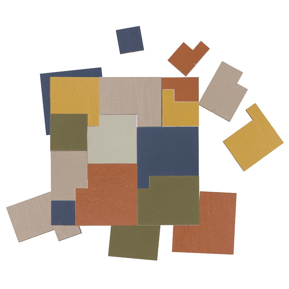 Das Holzpuzzle "Wirr 2" ist ein kleines Legepuzzle aus Holz, bei dem man die verschiedenen Puzzleteile zu einem Quadrat zusammenlegen muss. Die Verpackung ist nur etwas größer als eine Streichholzschachtel.
