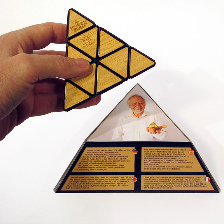 Bereits vor dem klassischen Würfel-Fieber der 80er Jahre wurde dieser spezielle Pyraminx-Würfel aus Holz vom weltweit bekannten Erfinder Uwe Meffert entwickelt und reizt die Puzzle-Sinne jedes Spielers, der es zum ersten Mal in der Hand hält oder der sich gerne an das knifflige Spiel von damals erinnert. Der gemischte Pyraminx ist durch mehrachsiges Drehen der Segmente wieder in seine geordnete Grundstellung zurück zu bringen.