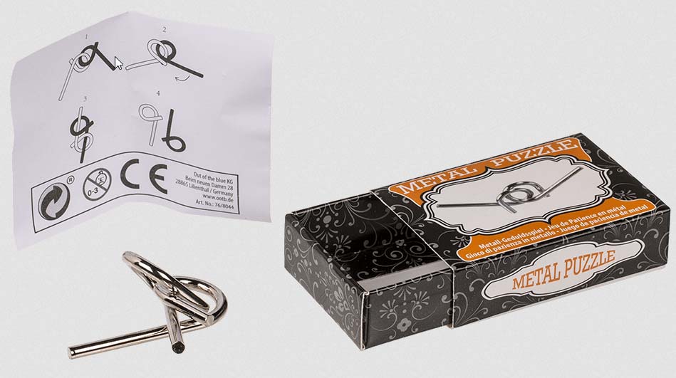 Das Metallpuzzle 7 ist ein klassisches Metallpuzzle, bei dem man die Puzzleteile auseinandernehmen und wieder zusammensetzen muss. Das Puzzle passt in eine Streichholzschachtel.