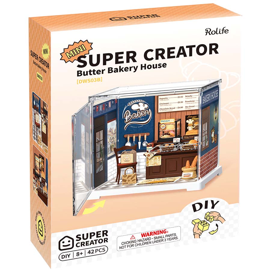 Der Bausatz "Butter Bakery House" aus der DIY Mini Super Creator Serie von Rolife ist für sich ein einzelner Raum, kann aber zusammen mit anderen Super Mini Creator Modellen zusammengesetzt werden. Das Modell ist aufgebaut ca. 10,9 x 14,7 x 15,7 cm groß und damit etwas kleiner als die normalen MOdelle aus der Super Creator Serie. Anders als die bekannten Rolife Miniature Houses bestehen diese Bausätze vor allem aus Plastik und sind deutlich leichter zusammenzubauen.