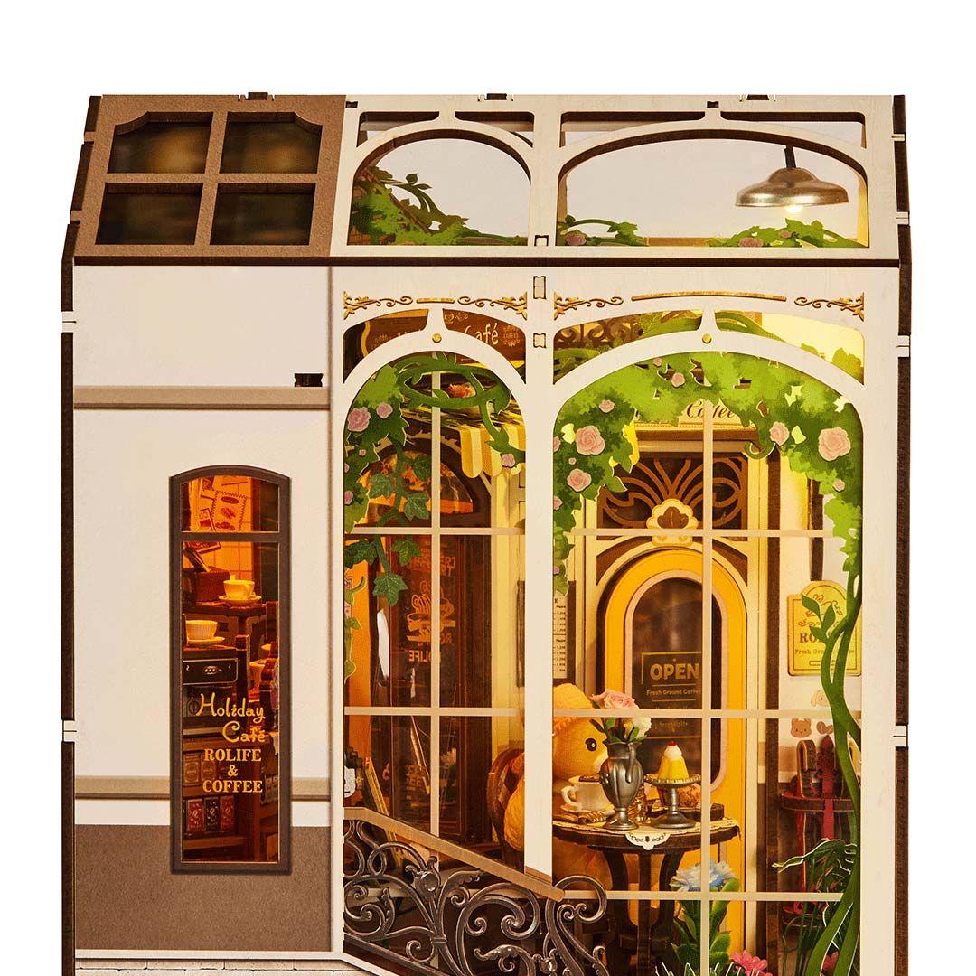 Der Bausatz "Holiday Café" aus der Stories in Books-Serie von Rolife. Der Bausatz enthält alles, was Sie zum Bauen dieser Straßenszene benötigen. Mit all den Holzteilen und Werkzeugen werden Sie nach und nach die gesamte Szene zusammenbauen. Diese Bücherecke wird auch eine einzigartige und exquisite Dekoration für Ihr Bücherregal und Ihren Schreibtisch sein. Im Dunkeln können Sie die Szenereie mit den mitgelieferten Lichtern in Szene setzen.