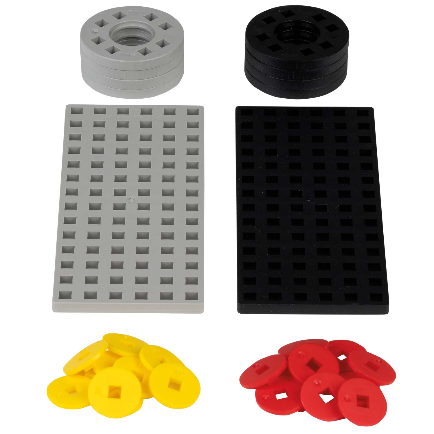 Dieses Zubehörset enthält 2 Grundplatten (1x schwarz und 1x grau) sowie 8 Räder in passenden Farben und 16 Naben in rot und gelb. Perfekte Ergänzung für die GO! Reihe