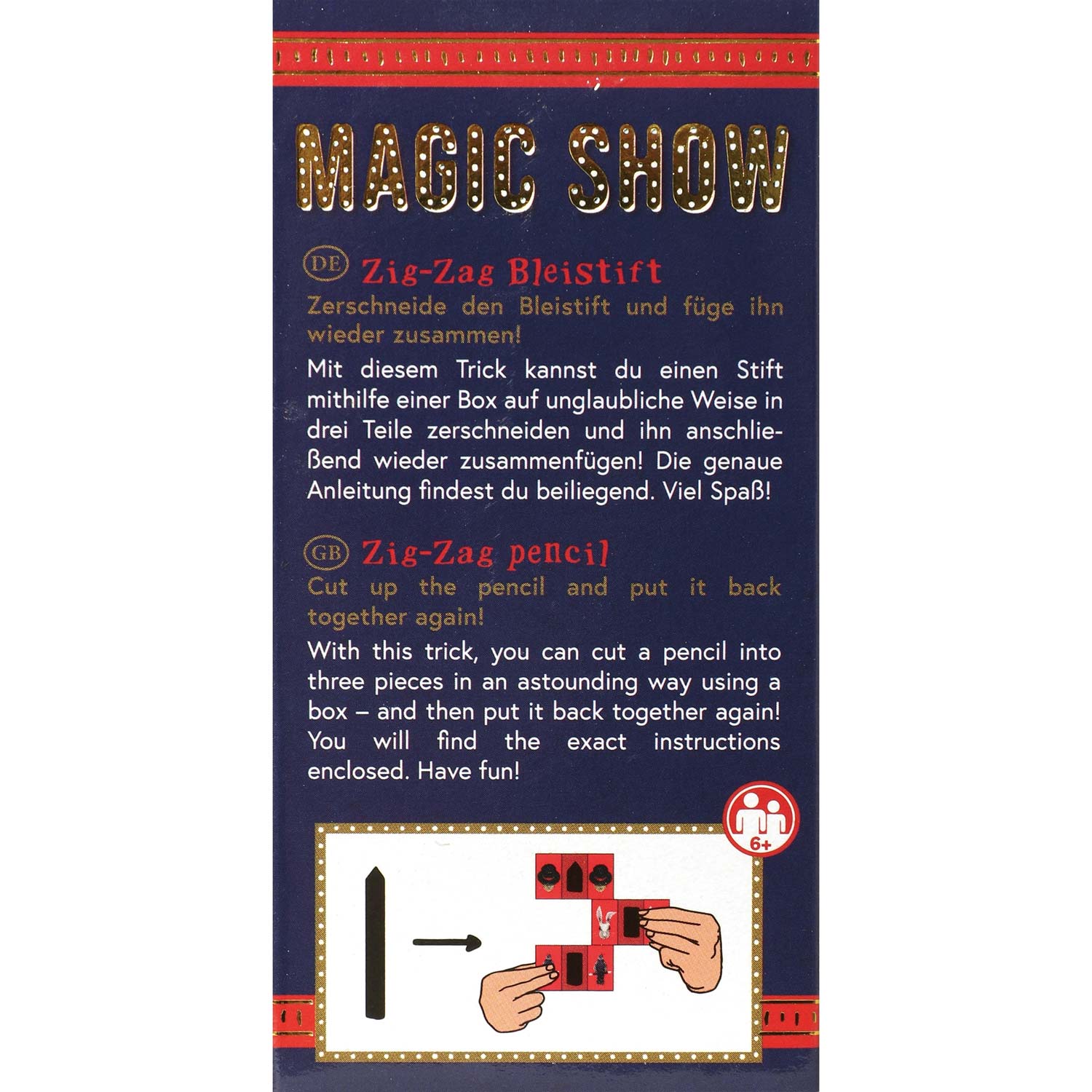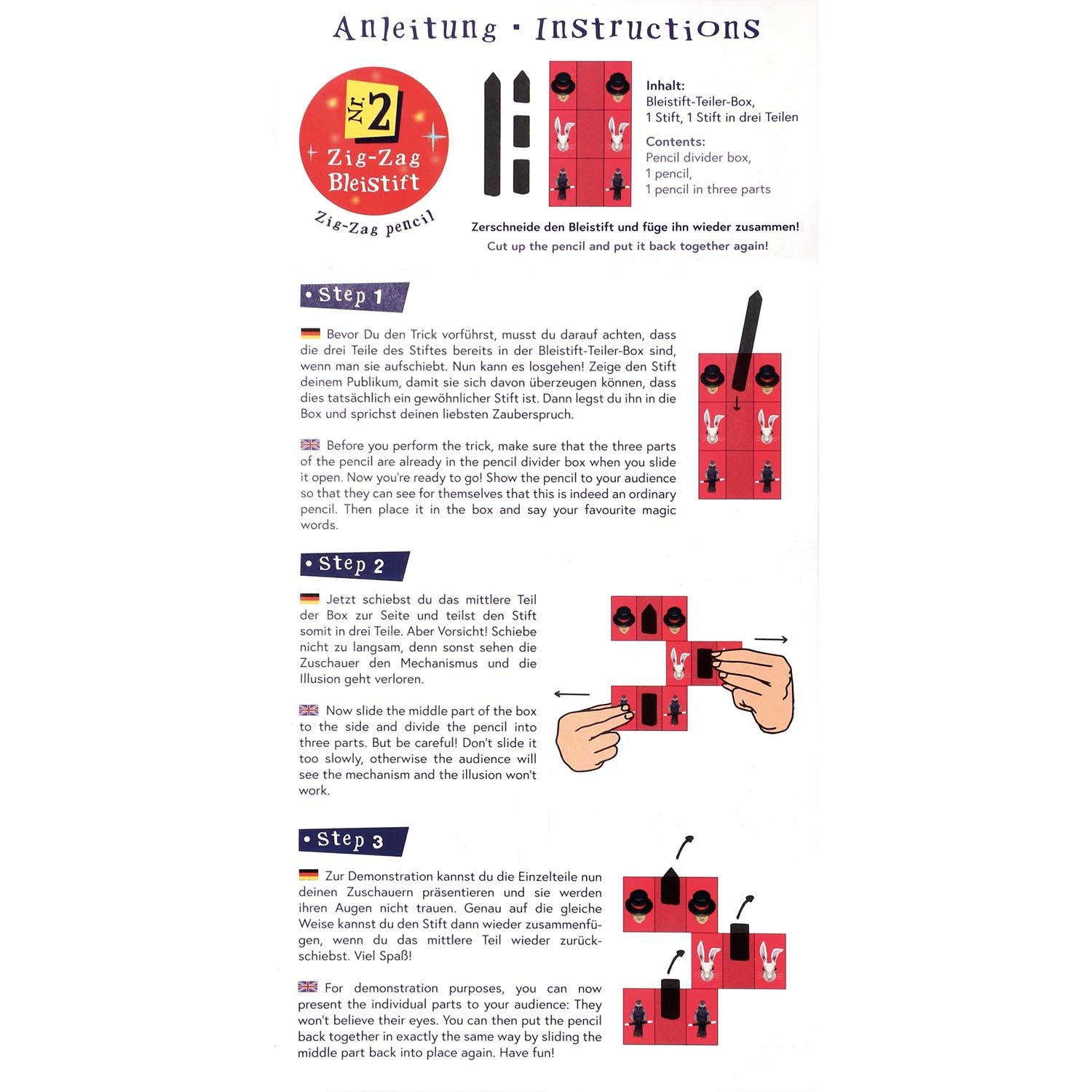Zerschneide den Bleistift und füge ihn wieder zusammen! Mit diesem Trick kannst du einen Stift mithilfe einer Box auf unglaubliche Weise in drei Teile zerschneiden und ihn anschließend wieder zusammenfügen! Die leicht verständliche, bebilderte Anleitung zeigt dir, worauf es bei dieser verblüffenden Illusion ankommt. Zusätzlich enthalten sind 5 Tickets, mit denen du zu deiner eigenen MAGIC SHOW einladen kannst.