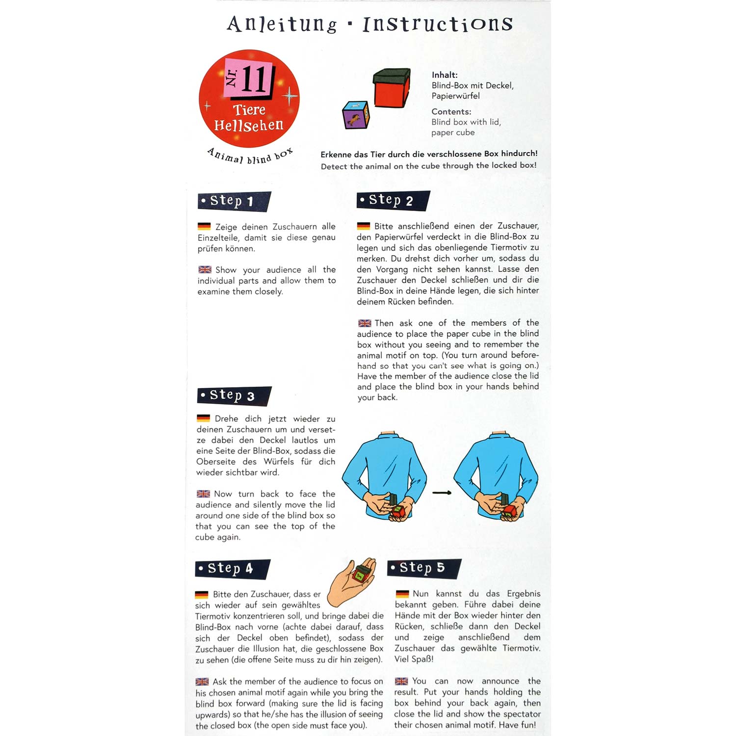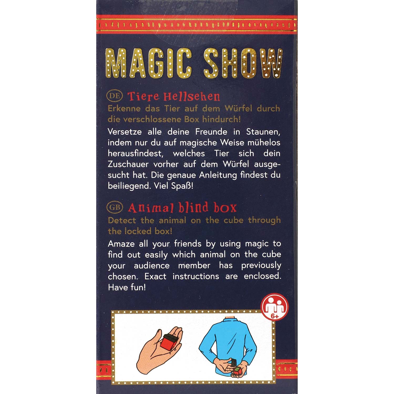 Erkenne das Tier auf dem Würfel durch die verschlossene Box hindurch! Versetze alle deine Freunde in Staunen, indem nur du auf magische Weise mühelos herausfindest, welches Tier sich dein Zuschauer vorher auf dem Würfel ausgesucht hat. Die leicht verständliche, bebilderte Anleitung zeigt dir, worauf es bei dieser verblüffenden Illusion ankommt. Zusätzlich erhältst du 5 Tricks, mit denen du zu deiner eigenen MAGIC SHOW einladen kannst.