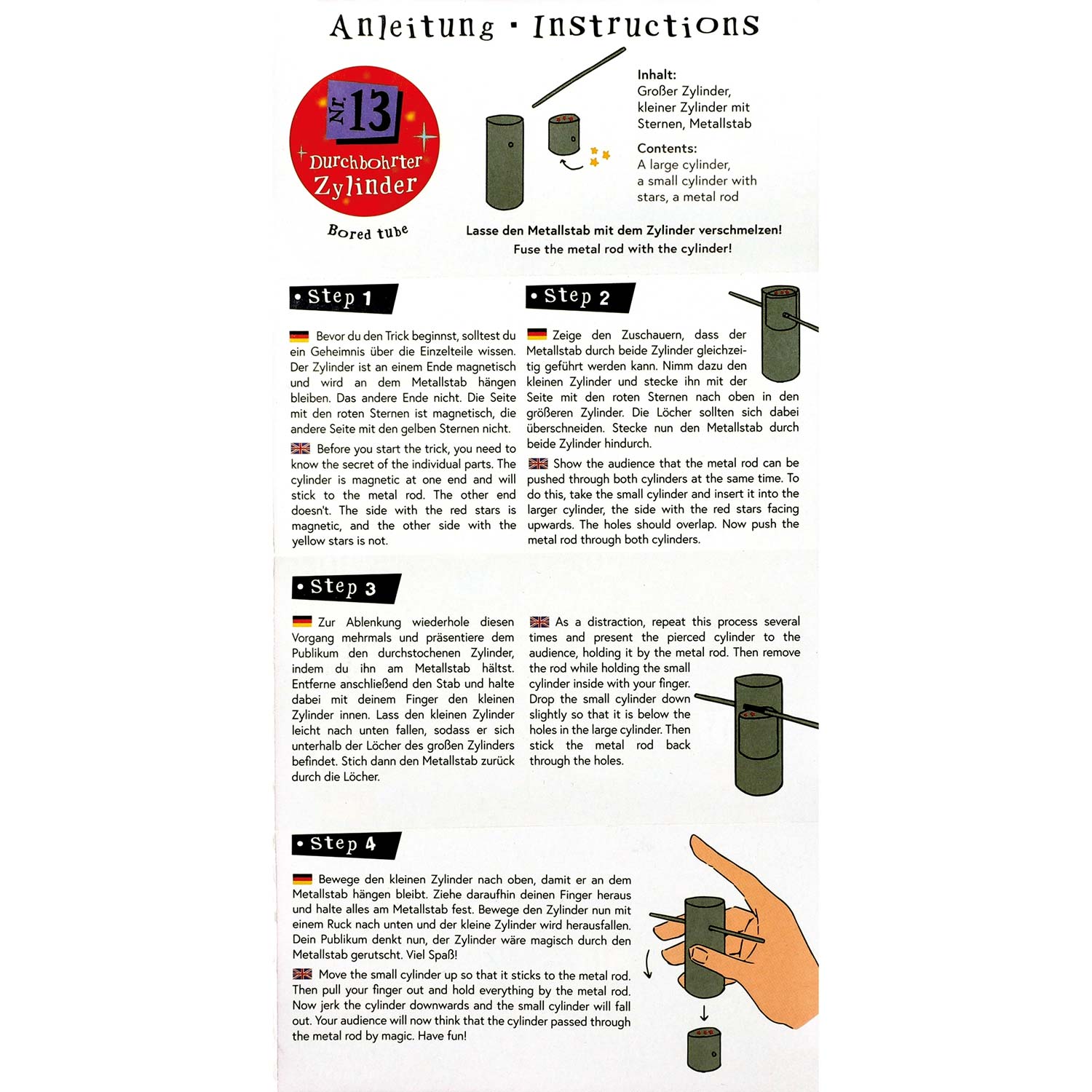 Mit diesem Zaubertrick kannst du dein Publikum beeindrucken, indem du einen Metallstab auf unglaubliche Weise mit einem Zylinder verschmelzen lässt. Anschließend kannst nur du sie wieder entzwei teilen! Die leicht verständliche, bebilderte Anleitung zeigt dir, worauf es bei dieser verblüffenden Illusion ankommt. Zusätzlich erhältst du 5 Tickets, mit denen du zu deiner eigenen MAGIC SHOW einladen kannst.