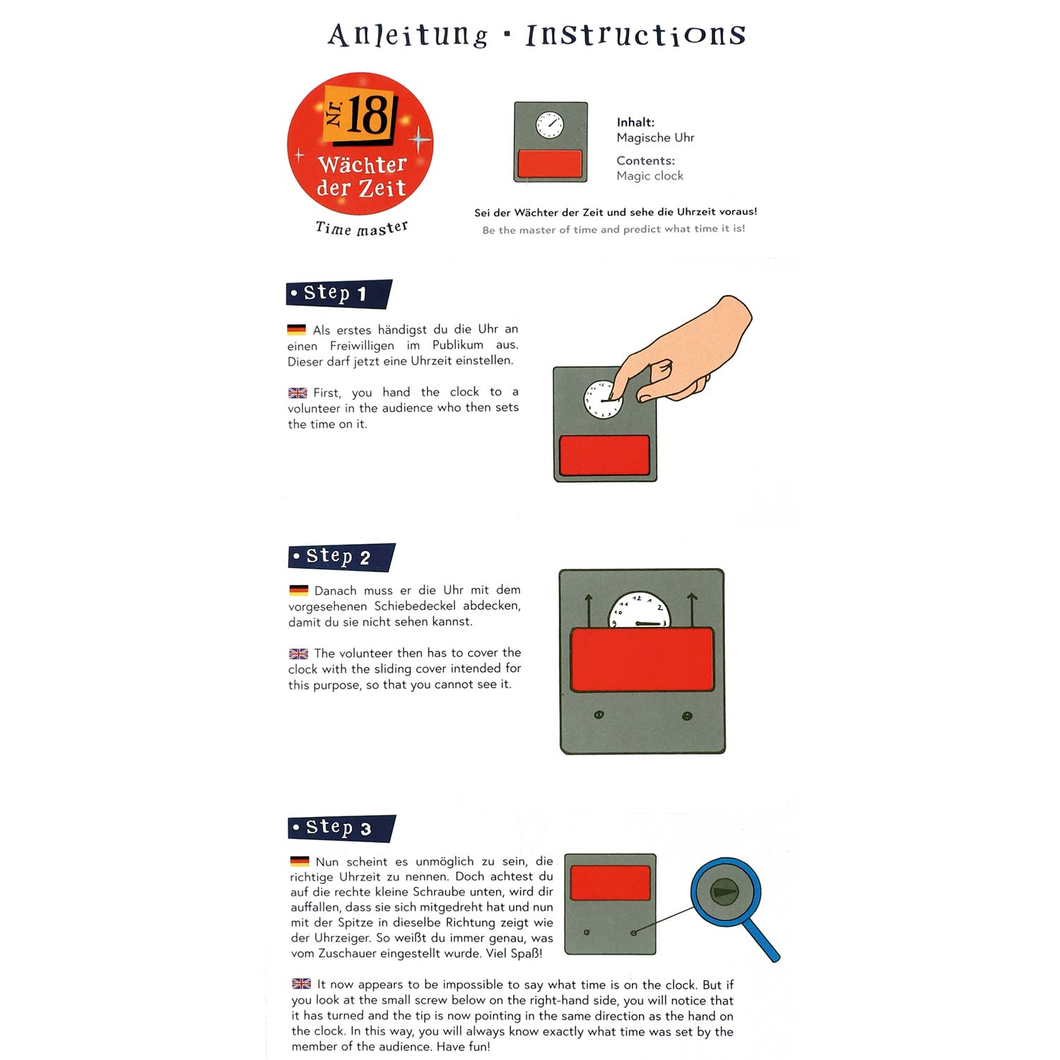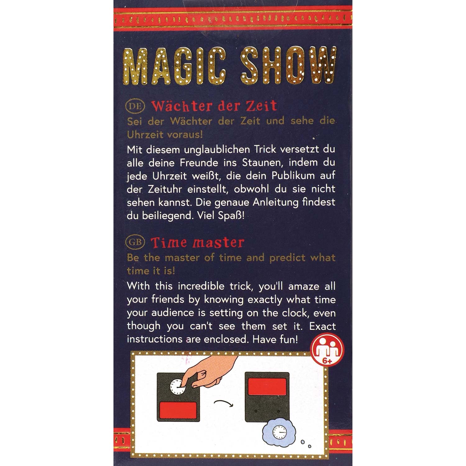 Sei der Wächter der Zeit und sehe die Uhrzeit voraus! Mit diesem unglaublichen Trick versetzt du alle deine Freunde ins Staunen, indem du jede Uhrzeit weißt, die dein Publikum auf der Zeituhr einstellt, obwohl du sie nicht sehen kannst. Die leicht verständliche, bebilderte Anleitung zeigt dir, worauf es bei dieser verblüffenden Illusion ankommt. Zusätzlich erhältst du 5 Tickets, mit denen du zu deiner eigenen MAGIC SHOW einladen kannst.