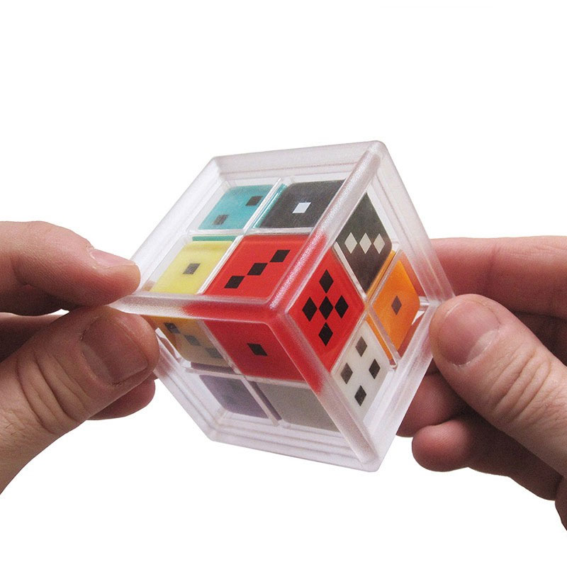 2) Ordnen Sie die Würfelflächen so an, dass die Anzahl der Punkte auf allen Seiten die gleiche Summe ergeben. Das Rätselspiel muss auf seine Füße gestellt werden, damit alle Würfel an ihre Stelle fallen.