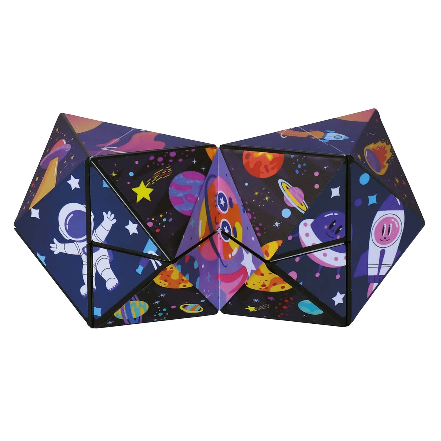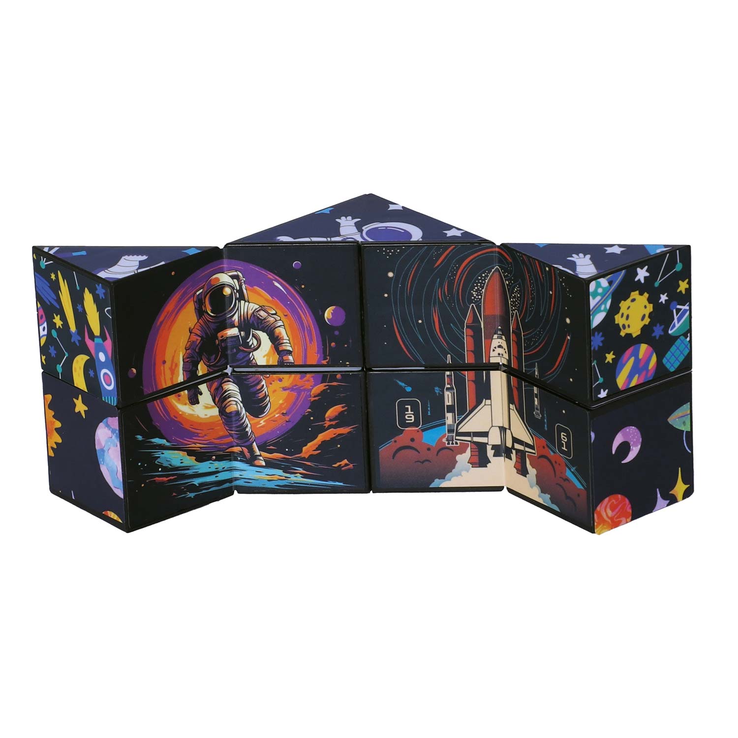 Durch Kippen, Falten oder Drehen sollen die zusammenhängenden Teile so angeordnet werden, dass ein Space-Motiv entsteht!