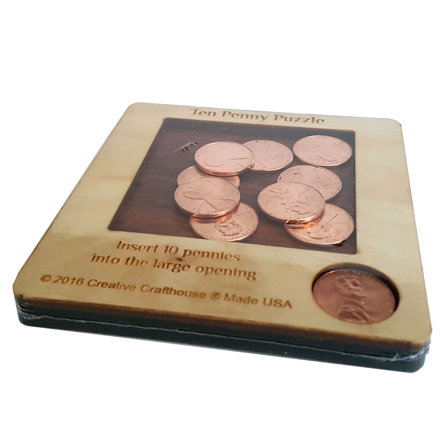 Das 10 Penny Puzzle besteht aus einer Grundplatte und zehn Penny Stücken. Dabei liegen bereits neun Pennies in dem ausgeschnittenen Rechteck. Aufgabe ist es, den zehnten Penny ebenfalls in das Rechteck zu bekommen. Was auf den ersten Blick einfach aussehen mag, kann durchaus zum Problem werden. Einige werden dieses Puzzle in 2 Minuten lösen, andere werden sich die Zähne daran ausbeißen.
