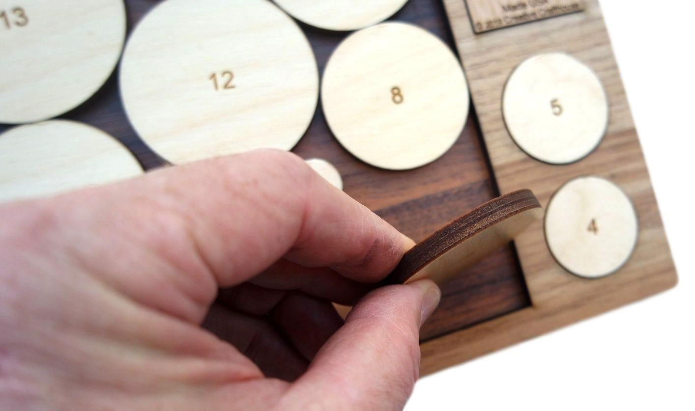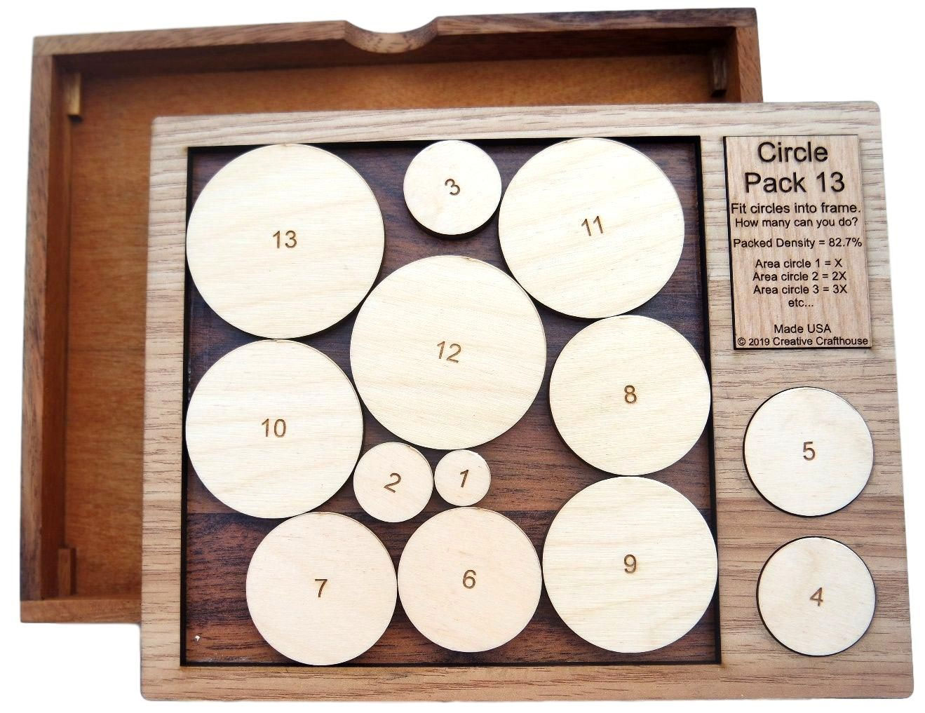 Das Circle Pack 13 Puzzle ist ein Legepuzzle mit mathematischem Hintergrund. Aufgabe ist es, alle runden Puzzleteile in die quadratische Aussparung zu bekommen. Dabei haben die Nummern auf den Puzzleteilen eine Bedeutung. Wenn 1 die Fläche x einnimmt, nimmt das Teil mit der 2 die Fläche von 2x ein, die 3 entsprechend 3x usw. Durch die Zahlen können Sie selber zählen, wie viele x Sie in das Quadrat bekommen haben. Das Maximalergebnis von 91 ist extrem schwer.