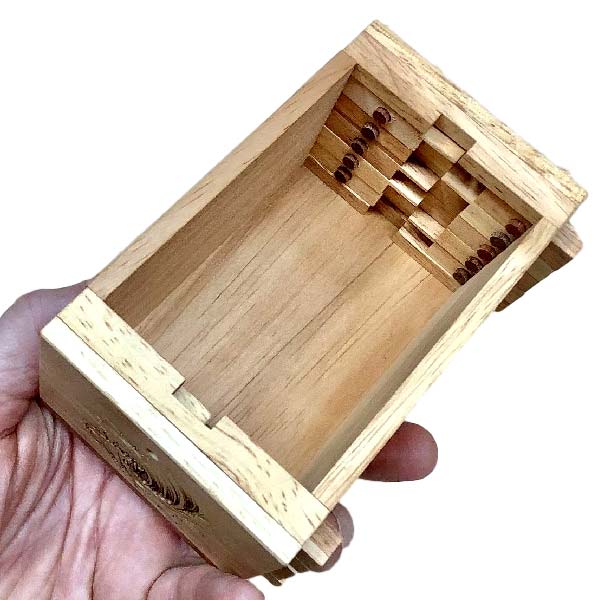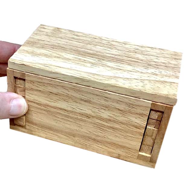 Die Secret Lock Box ist eine Erfindung vom Creative Crafthouse und ist eine tolel Verpackung für Geschenke oder Überraschungen. Die Box hat 5 verschiebbare Stäbe, die alle in der richtigen Position stehen müssen, damit die Box geöffnet werden kann. Die Premium Version wurde aus hochwertigem und deutlich festerem Gummibaumholz hergestellt und ist deutlich heller als die normale Box. Außerdem verfügt sie über eine andere Kombination.