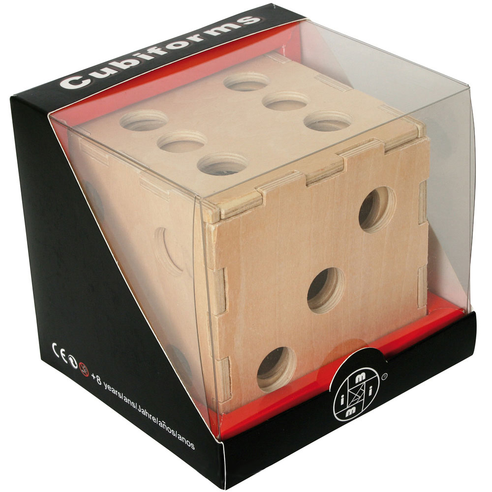Holzpuzzle Cubiforms "Dice in Dice" von MI Toys. Aufgabe: Die Würfel müssen so zusammengebaut und der kleine im großen platziert werden, dass der große Würfel ein regulärer Augenwürfel wird.