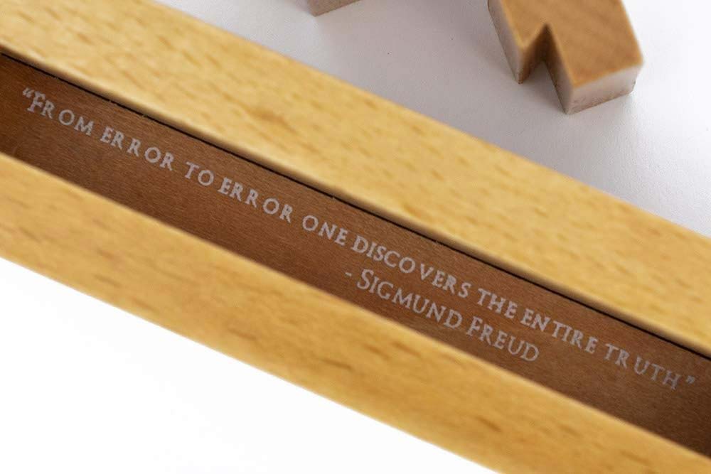 Können Sie entdecken, wie Sie diese clevere kleine Trickbox aus Holz öffnen, um den Bleistift und das Zitat im Inneren zu entriegeln?Sigmund Freud basiertes Gehirn-Teaser-Puzzle. Teil der Great Minds Kollektion von Professor Puzzle.