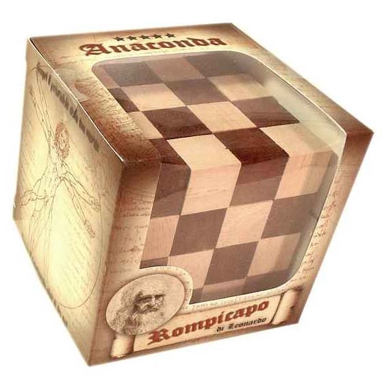 Das Holzpuzzle Anaconda besteht aus 64 kleinen Würfeln, die mit einer Gummischnur verbunden sind. Wenn es zerlegt ist, entsteht eine lange Reihe aus kleinen Würfeln: eine riesige, 90cm lange Anaconda! Aufgabe: Die einzelnen Würfel wieder zu einem großen Würfel zusammenlegen.