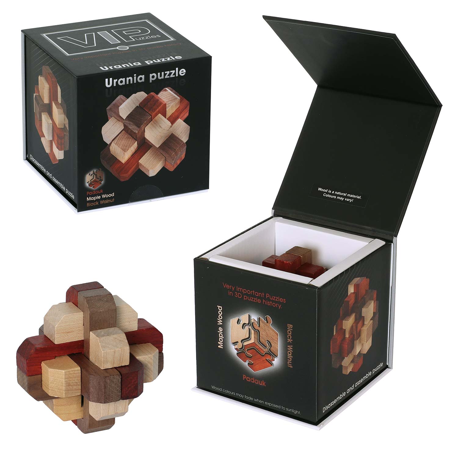 Das Urania Puzzle aus der VIP Puzzle Serie besteht aus 24 Puzzleteilen und ist mit 9 x 9 x 9 cm größer als die normalen Holzpuzzle. Außerdem wurden die VIP Puzzle nicht aus einfachem Holz, sondern aus rotem Padouk, schwarzem Nussbaum und weißem Ahorn hergestellt. Damit haben sie eine ganz andere Qualität als die Standard-Holzpuzzle.