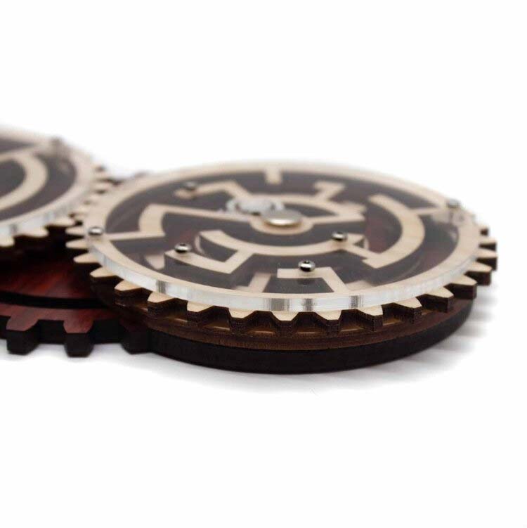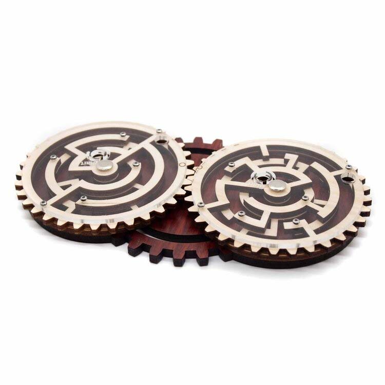 Das Zahnradlaby besteht aus zwei Hälften, die jeweils ein eigenes Labyrinthen enthalten. Kompliziert wird es durch die Zahnräder, mit denen die beiden Labyrinthe verbunden sind. Drehen Sie eine Seite, dreht sich automatisch auch die andere. Natürlich müssen beide Seiten gleichzeitig und nicht hintereinander gelöst werden!