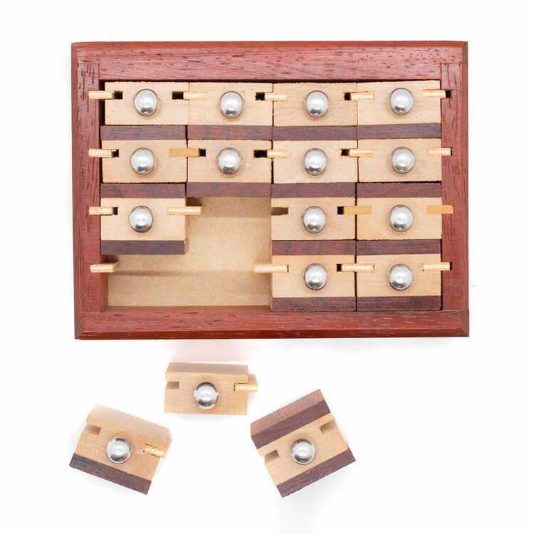 Der Apothekerschrank ist ein Packpuzzle in Form eines Schrankes. Alle Schubladen sehen im Schrank zwar gleich aus, haben aber alle eine andere Größe. Aufgabe ist es, die Schubladen einzusortieren, so dass die Schrankfront einheitlich aussieht.