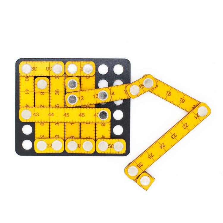 Das Metermaß von Constantin besteht aus einem langen Zollstock mit unterschiedlich langen Elementen. Diese sind so verbunden, dass sie übereinander und untereinander passen. Aufgabe ist es, alle Elemnte zu einem Rechteck zu formen, damit es auf die Grundplatte passt. Sieht einfacher aus als es ist!