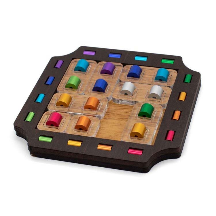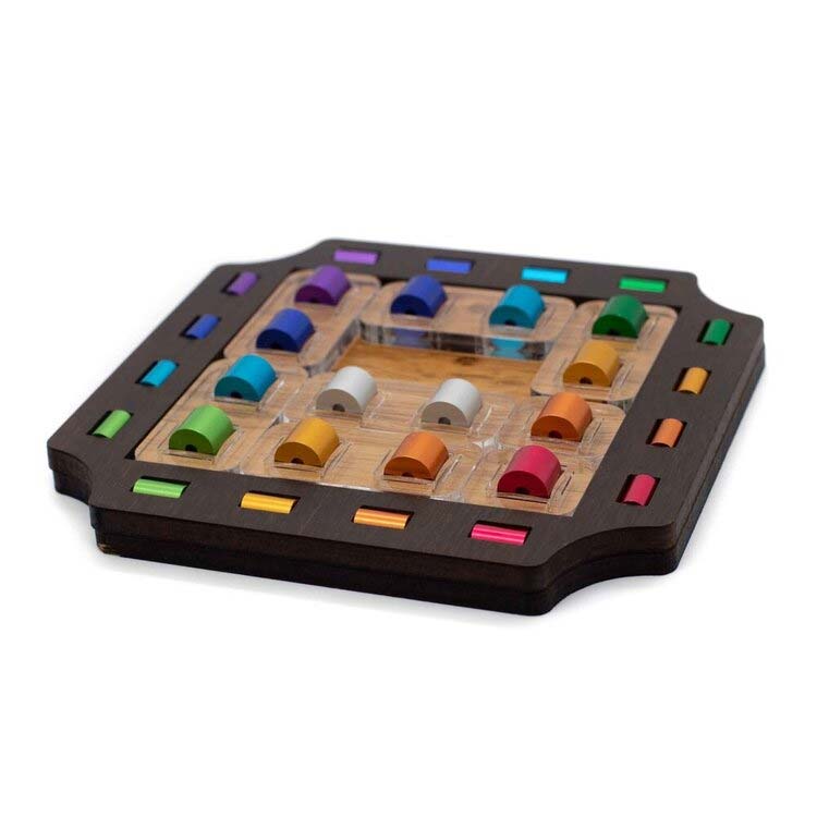 Das Slide Elox besitzt einen Holzrahmen, in deren Rand farbige Stifte in acht verschiedenen Farben platziert sind. Aufgabe ist es, die acht Acrylplatten, die ebenfalls farbige Stifte besitzen, so zu verschieben, dass Ihre Stifte zu den Farben im Rahmen passen. Es gibt acht verschiedene Startpositionen, die verschiedene Schwierigkeitsgrade haben. Die Startpositionen liegen dem Puzzle bei.