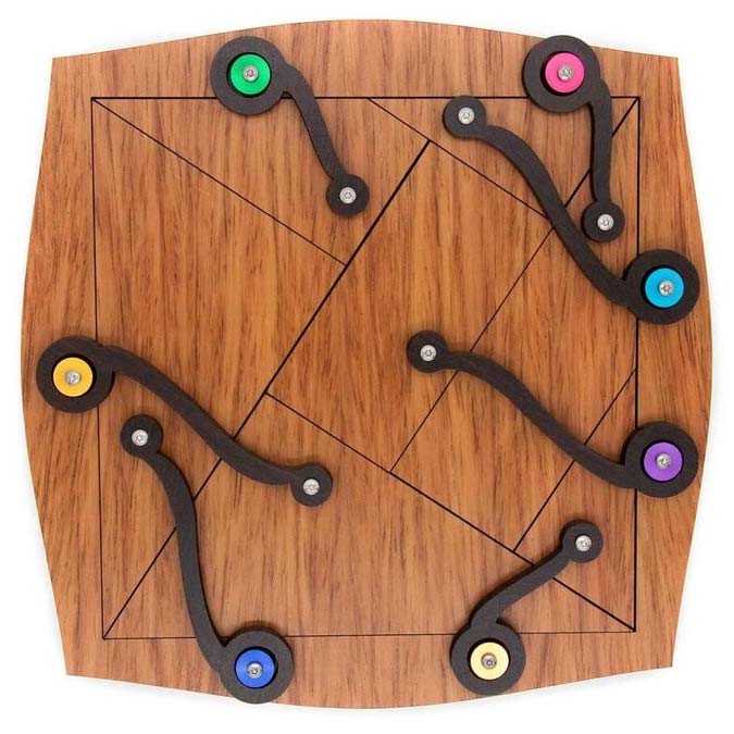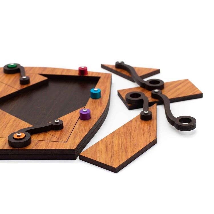 Elege ist ein Legepuzzle in besonderem Design. Jedes Puzzleteil verfügt noch über einen Arm, der um 360 Grad drehbar ist. Aufgabe ist es, die Puzzleteile in die Form zu legen, so dass jedes Armloch um eines der farbigen Elemente am Rand passt.