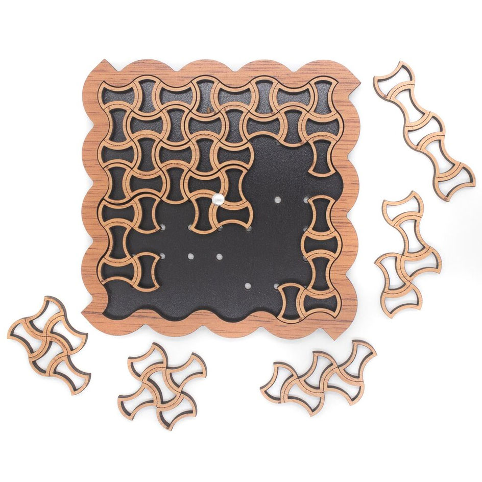 Escherwelle ist ein klassisches Legepuzzle. Aufgabe ist es, die Puzzleteile in die Form zu bekommen. Dabei sind je Puzzleteil unterschiedlich viele Elemente bereits verbunden, was das Zusammenlegen erst schwer macht.