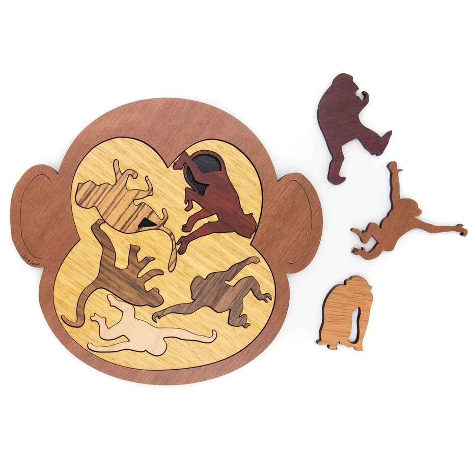 2) Alle Affen in die äußere Form legen. 3) Es wird noch ein Oval mit einem Schlitz mitgeliefert. Stapeln Sie die Affen, indem Sie sie in den Schlitz stellen.
