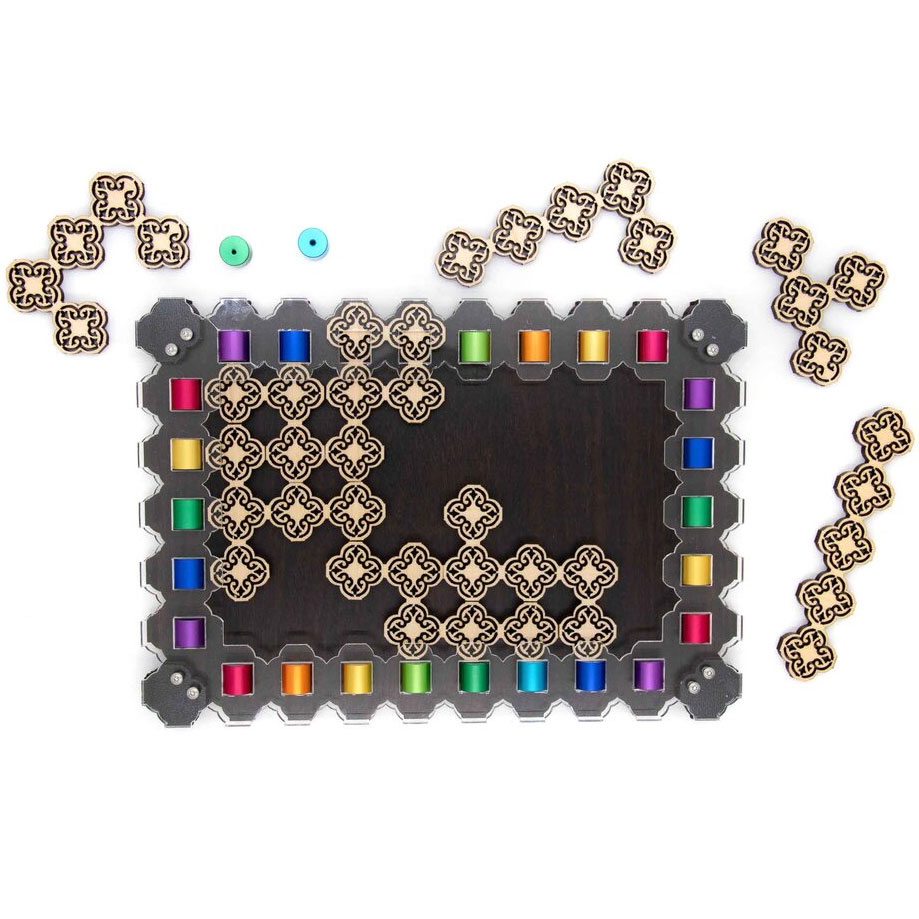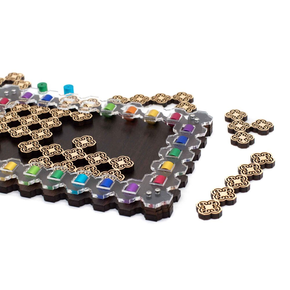 Das Orient Elox von Jean Claude Constantin besteht aus bunten eloxierten Metallperlen und 9 kunstvoll dekorierten Holzstücken. Das Ziel ist es, alle Teile in den Rahmen zu legen. Sie werden aber schnell erkennen, dass die bunten Perlen verhindern, dass die Holzteile vollständig unter die Acryllippe rutschen, die den Rand des Puzzles umgibt. Das Spiel oder Puzzle besteht darin, zwei Perlen Ihrer Wahl zu entfernen (mit Ausnahme der beiden Perlen, die sich in derselben Ecke befinden) und dann herauszufinden, wie die Teile in den Rahmen passen.