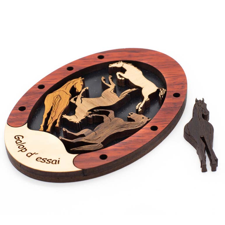 Galopp ist ein klassisches Legepuzzle von Jean Claude Constantin. Alle fünf Pferdchen müssen in das Feld. Aber bitte ohne drängeln und drücken.