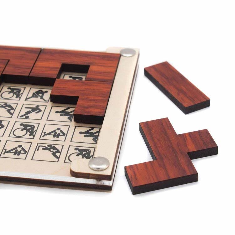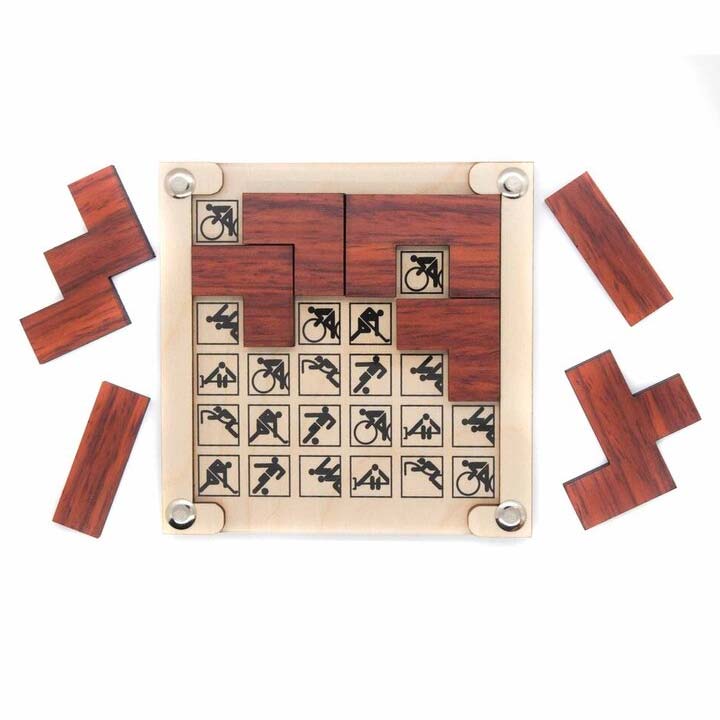 Denksport ist ein Legepuzzle mit sechs verschiedenen Lösungen von Jean Claude Constantin. Aufgabe ist es, die Puzzleteile so in die Form zu legen, dass nur gleiche Symbole angezeigt werden.