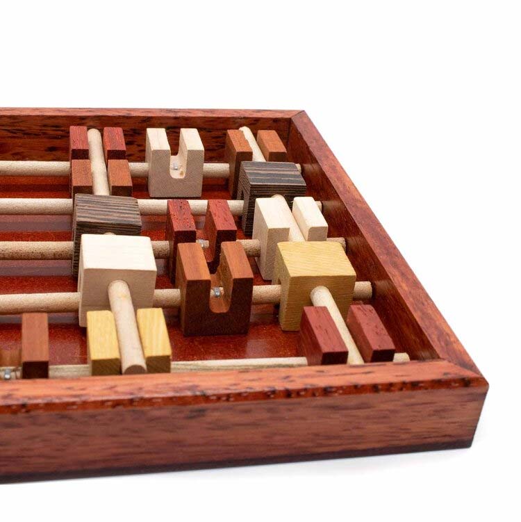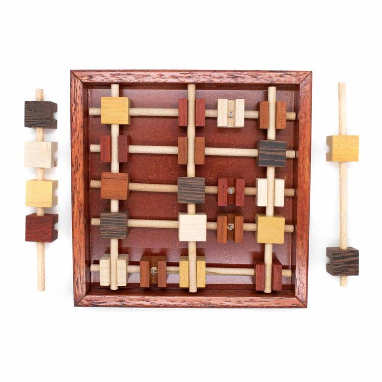 Brochettes ist ein Packpuzzle von Jean Claude Constantin. Die Puzzleteile bestehen aus Blöcken und Stäben, die teilweise miteinander verbunden sind. Nehmen Sie alle Teile heraus und versuchen Sie, anschließend alle Teile wieder in die Form zu bekommen. Als besondere Herausforderung können Sie versuchen, in jede Reihe die gleiche Holzart zu legen.