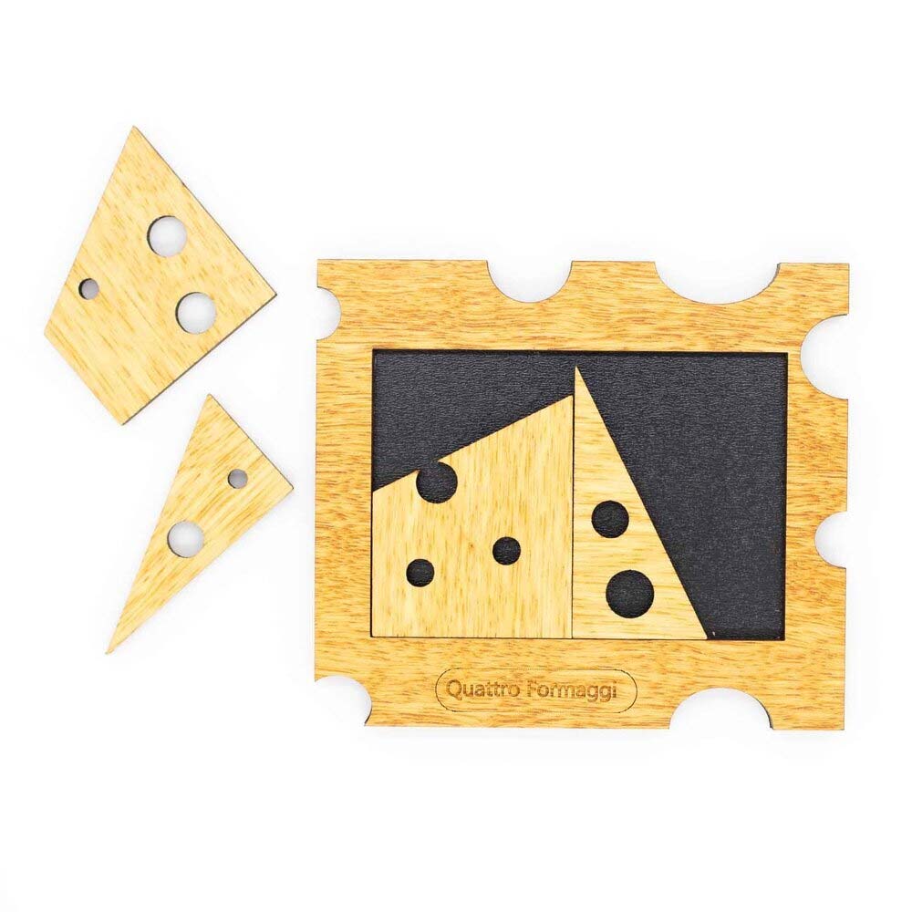 Quattro Formaggi ist ein Legepuzzle von Jean Claude Constantin. Aufgabe ist es, alle vier Käseteile in die Form zu legen. Geht garantiert ohne drücken.