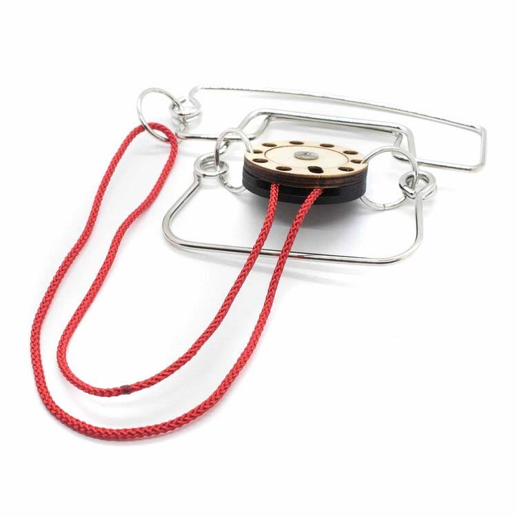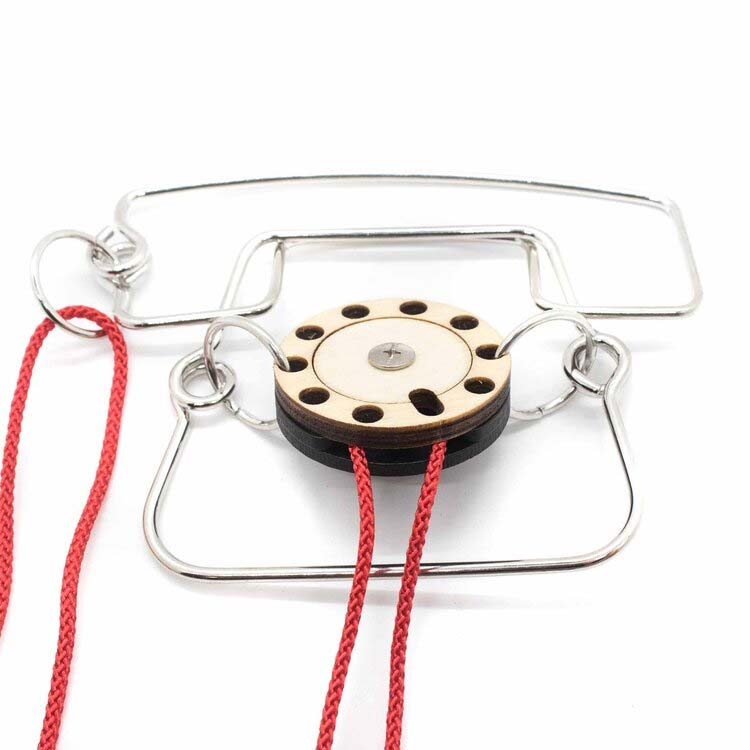 Das Telefon besteht aus einem Hörer, der mit einem Seil an einer hölzernen Wählscheibe befestigt ist. Aufgabe ist es, den Hörer von der Wählscheibe zu trennen.